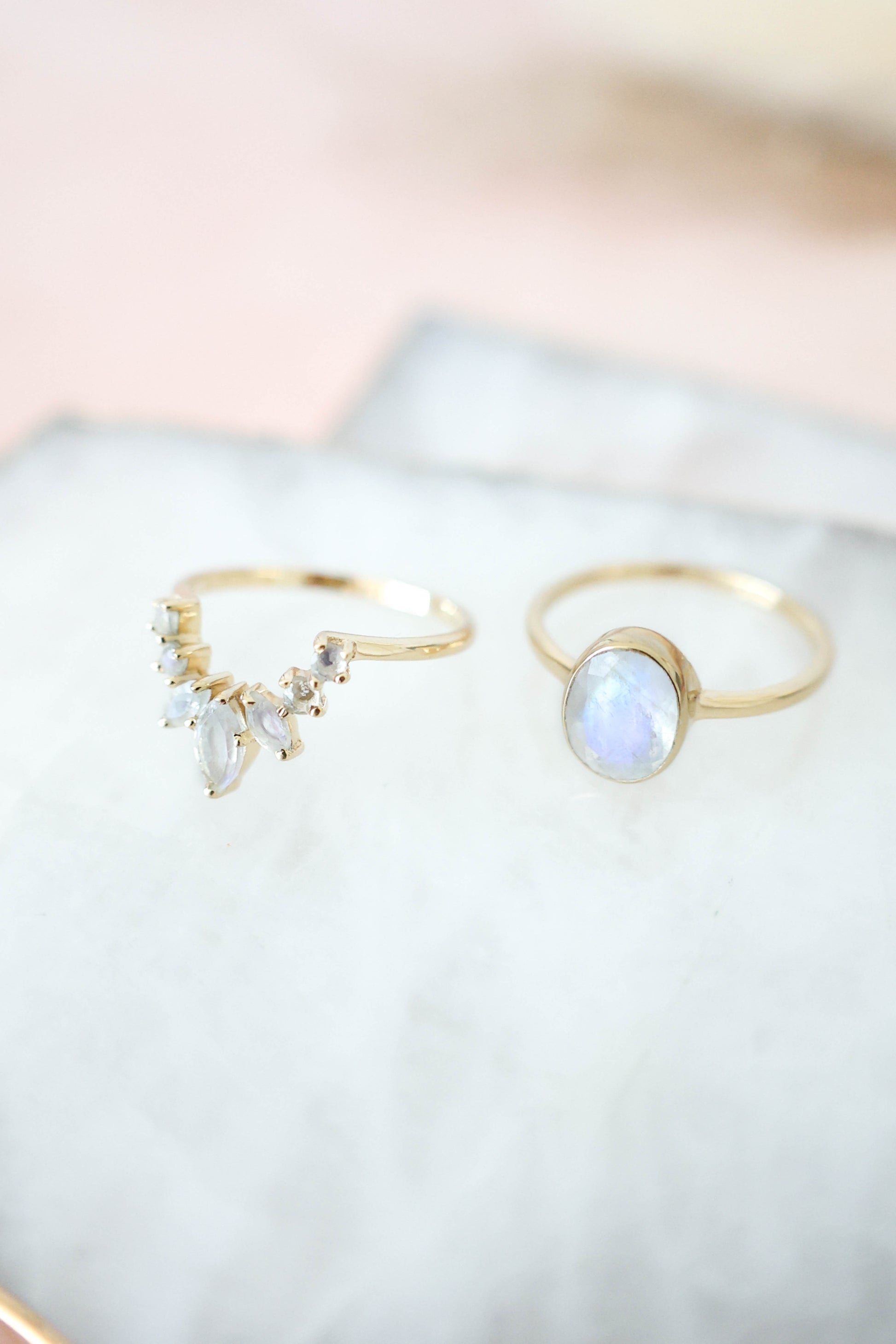 Want to stack? We got you! The Aurora ring set is the perfect duo, and we've done the work for you! Stacked and ready to go, this set is absolutely stunning. With its faceted cut dainty rainbow moonstone gems creating a halo around a shimmery oval stone, you truly can't go wrong with this statement piece.