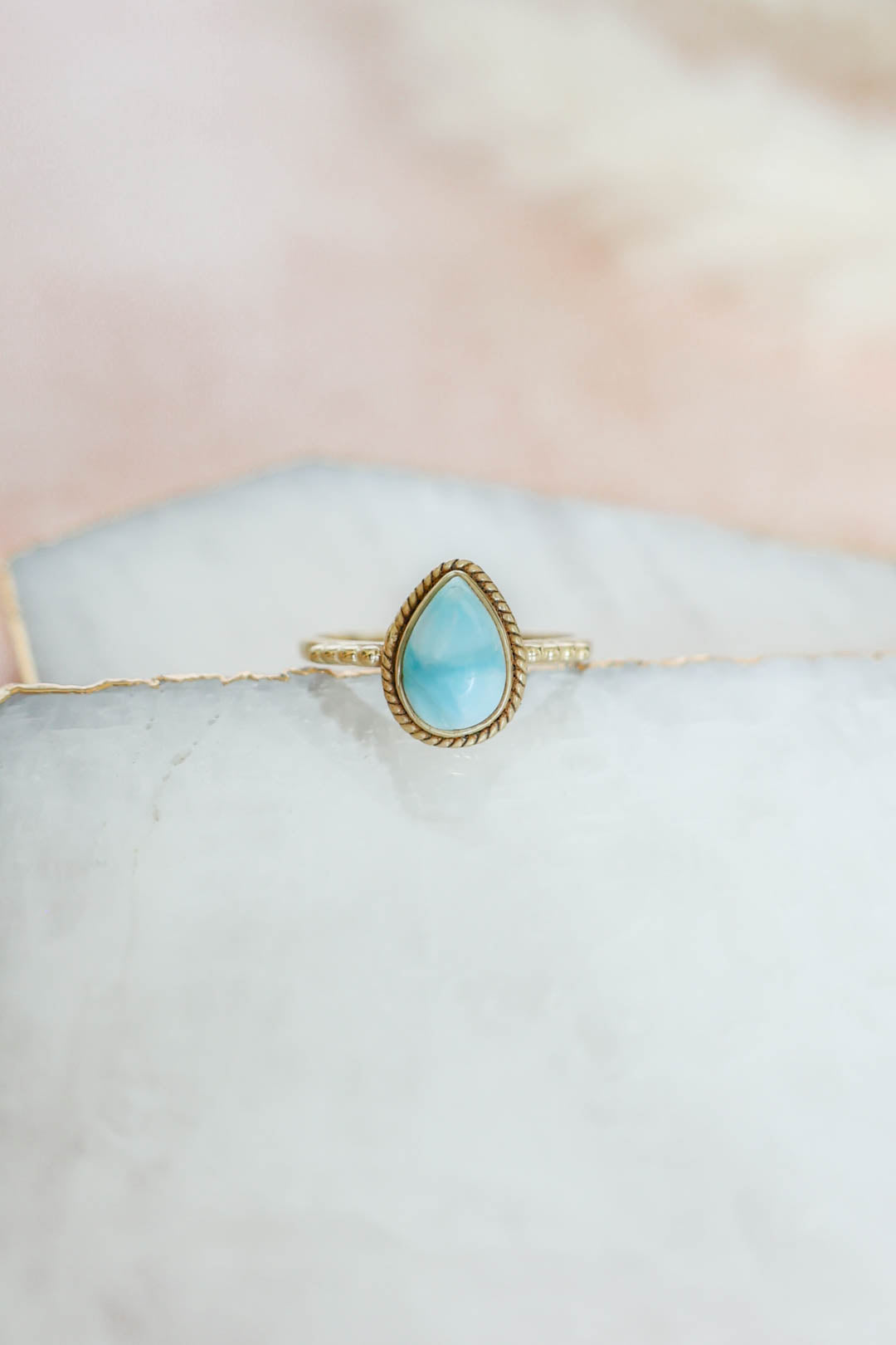 The perfect simple but cute, all day, every day ring! This dainty pear shaped Larimar ring with rope detailing surrounding the stone and a studded detail band is set in 14k gold vermeil. This is one of our best sellers, so you can't go wrong with this cutie for you, or as a gift!
