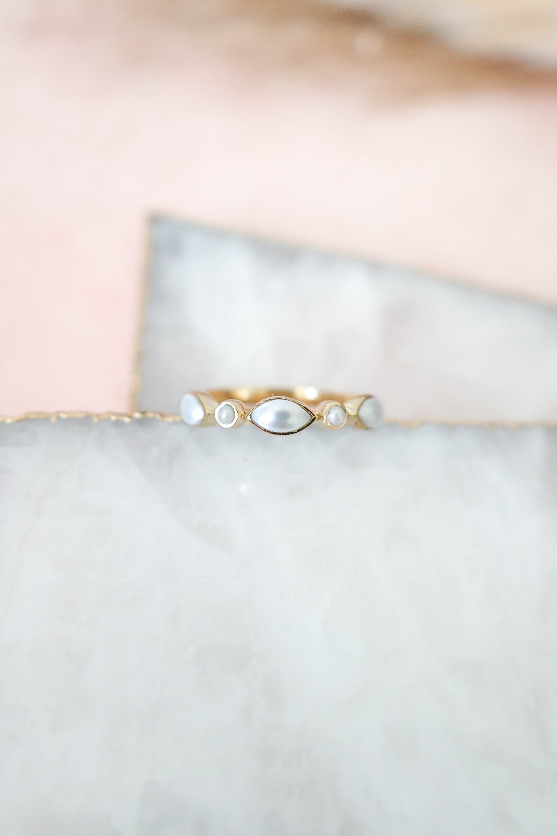 It's all in the details and this ring has it all figured out. This dainty pearl ring set in 14k gold vermeil is ready to fit right into your stack. Its horizontal marquise stones between two dainty round stones give it dimension and a unique look, while still staying minimal and simple.