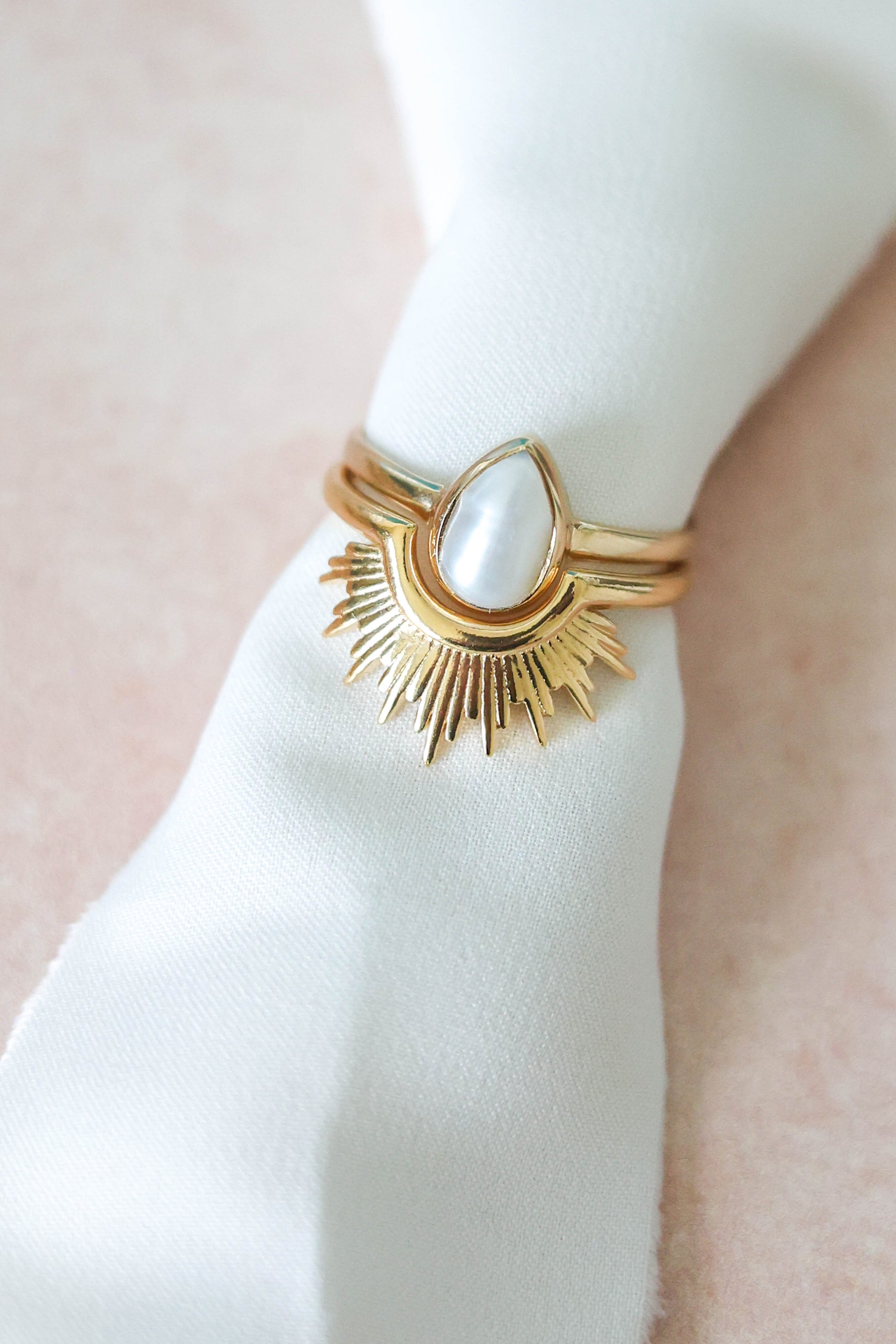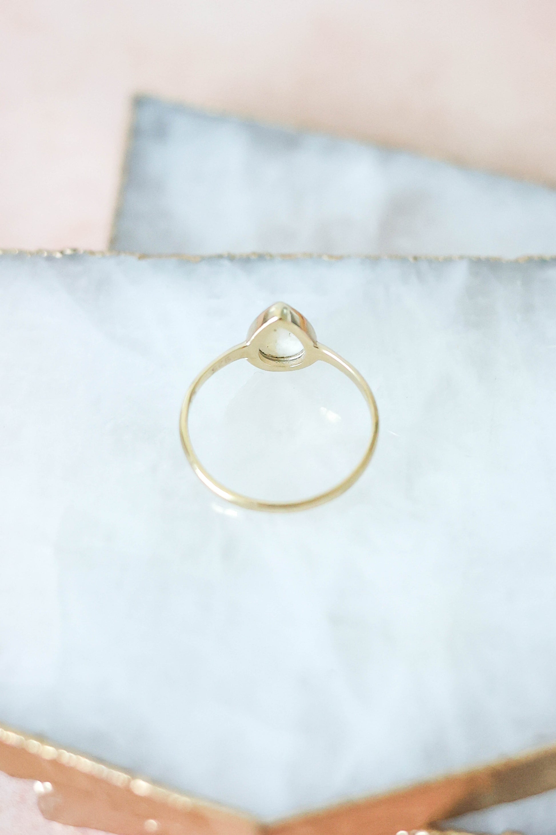 Dainty stackable pearl ring set in 14k gold vermeil. Wear this ring on its own or pair it with others. Add the 'Sole Ring' for a gorgeous sun inspired stacked look or the 'Avra Ring' for a more simple stack as shown in the photos!