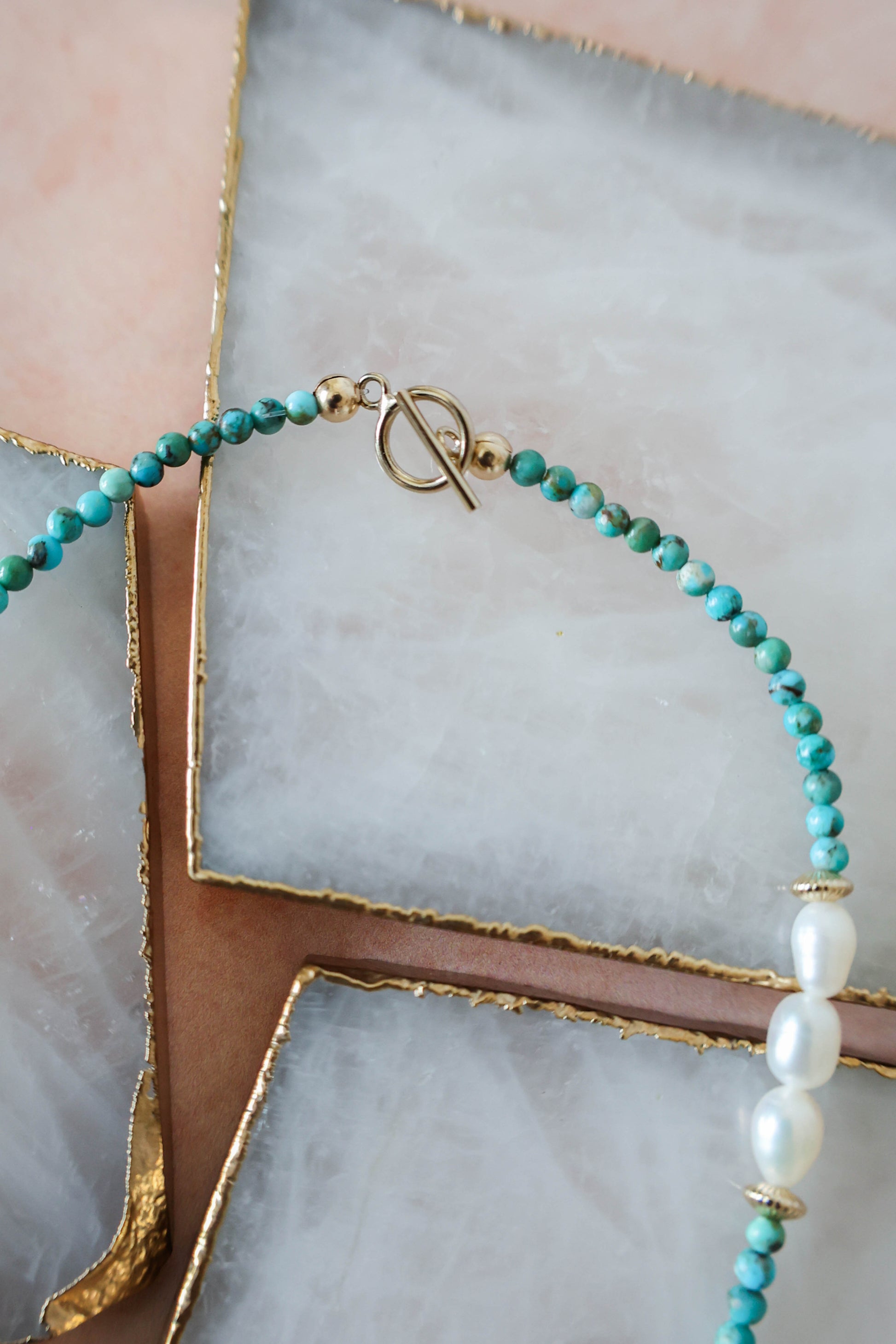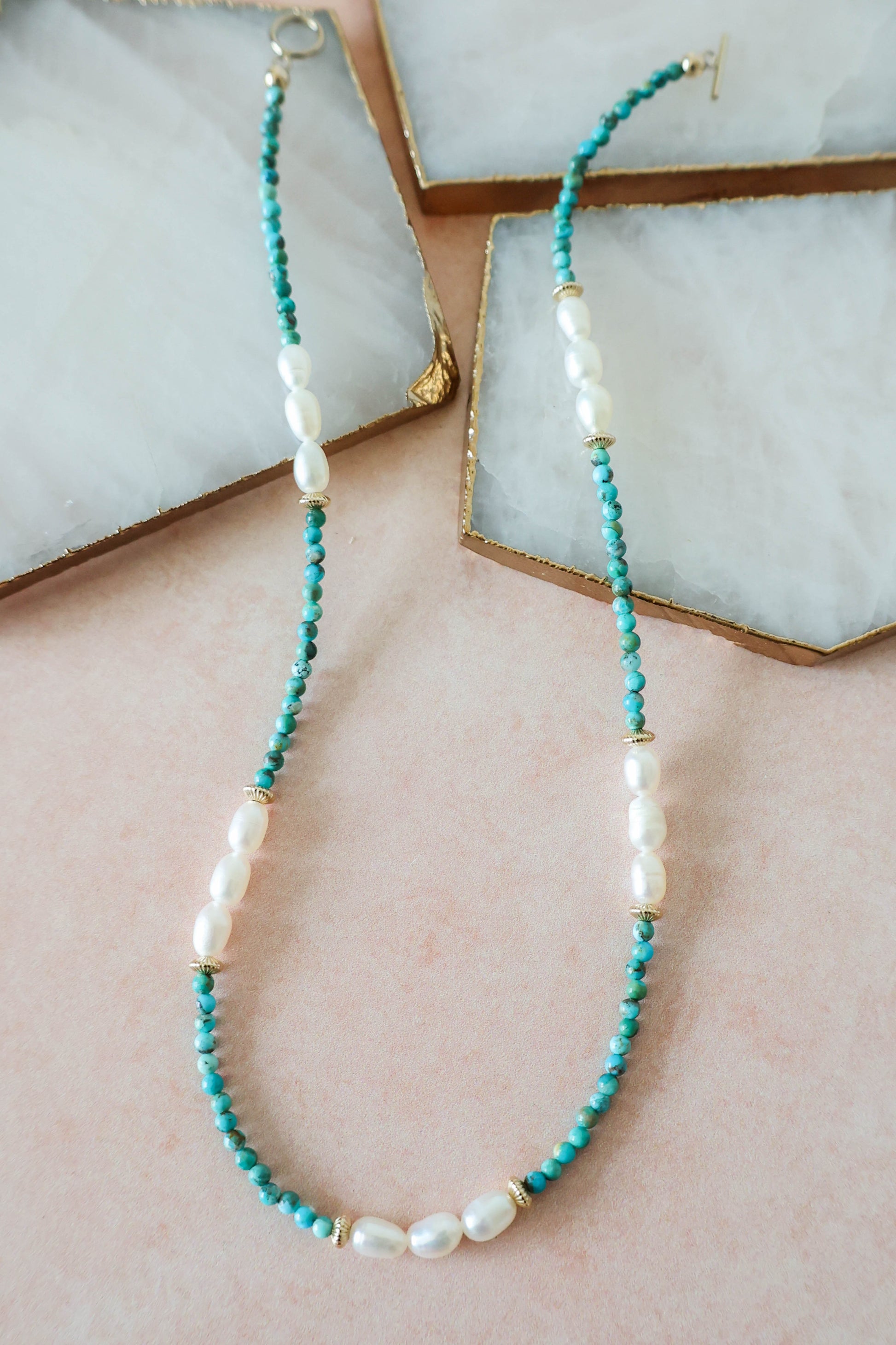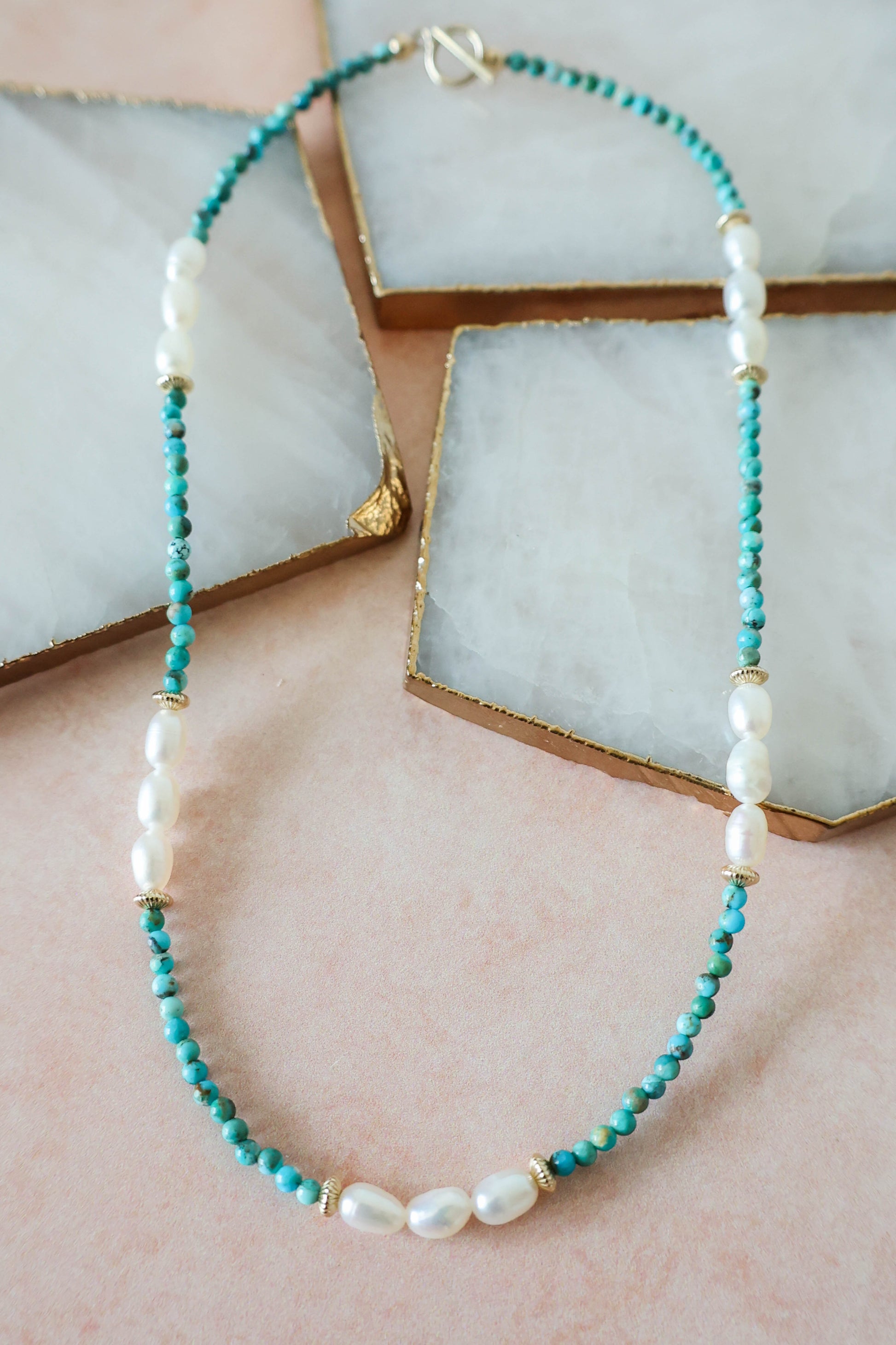 Turquoise and pearls? We can't think of a better combo. This stunner is handcrafted with natural turquoise beads and freshwater pearls, featuring gold corrugated saucer beads and a toggle clasp. She's ready for any occasion, but is this not the perfect vacation piece?! It's the pop of color you need to pack!