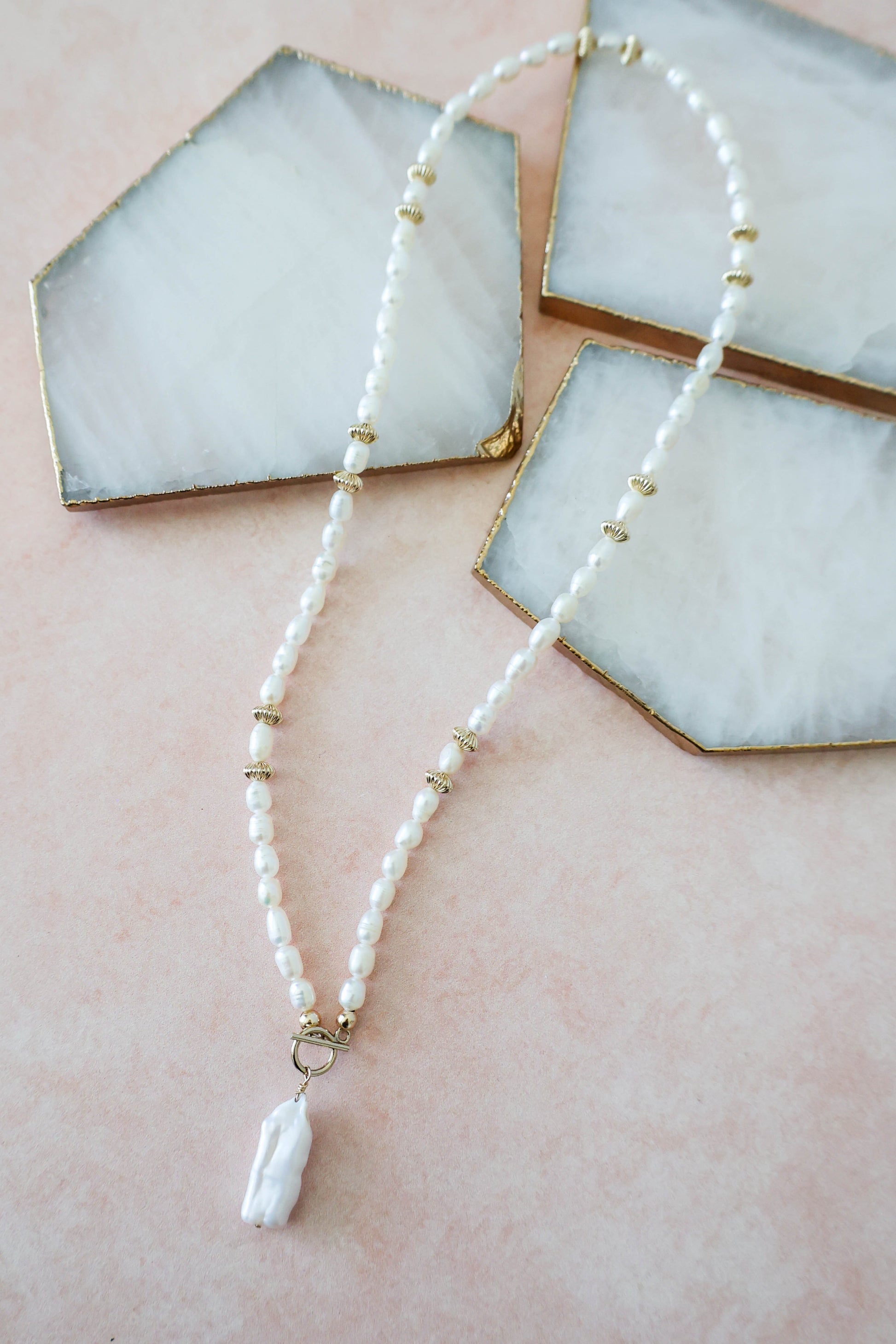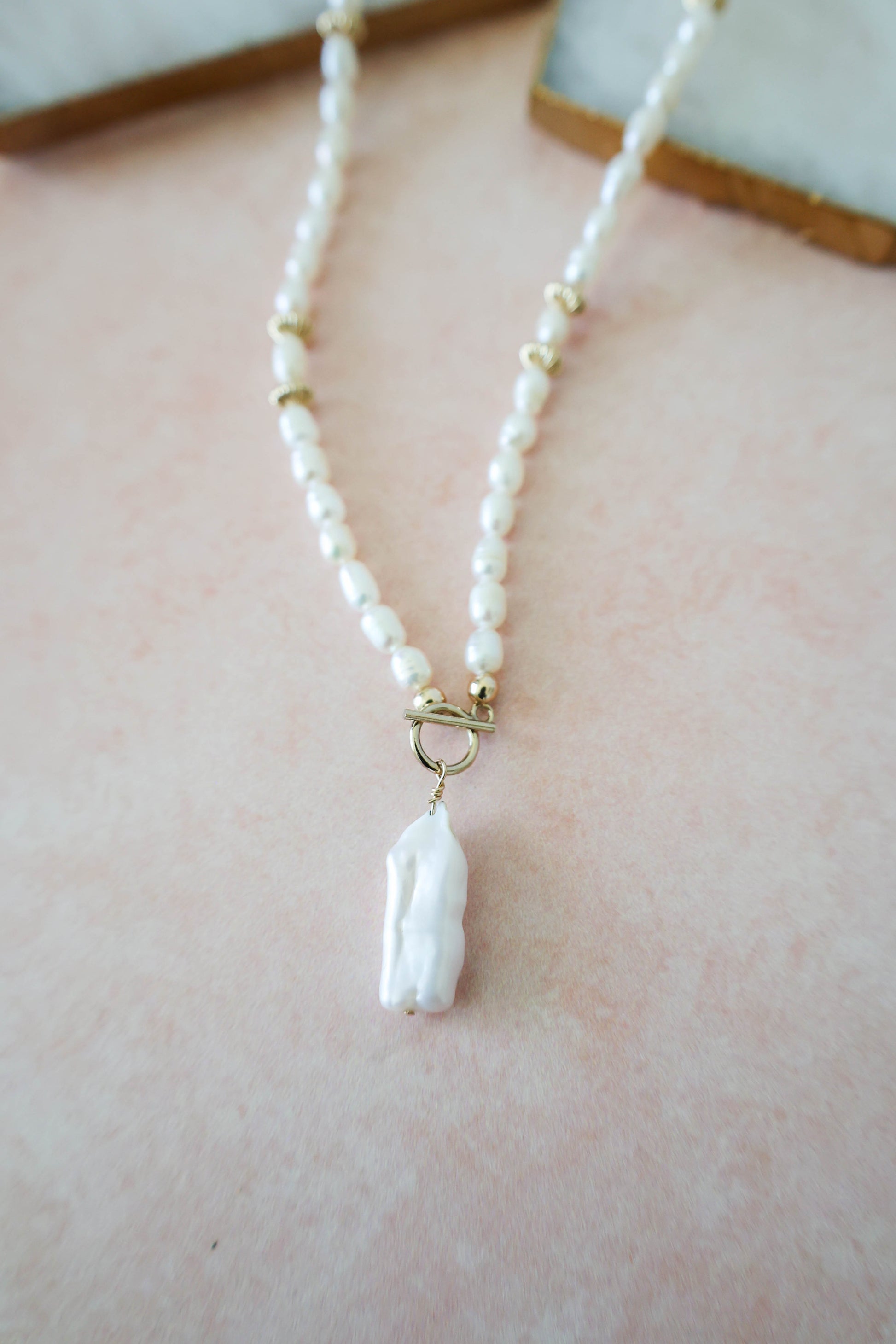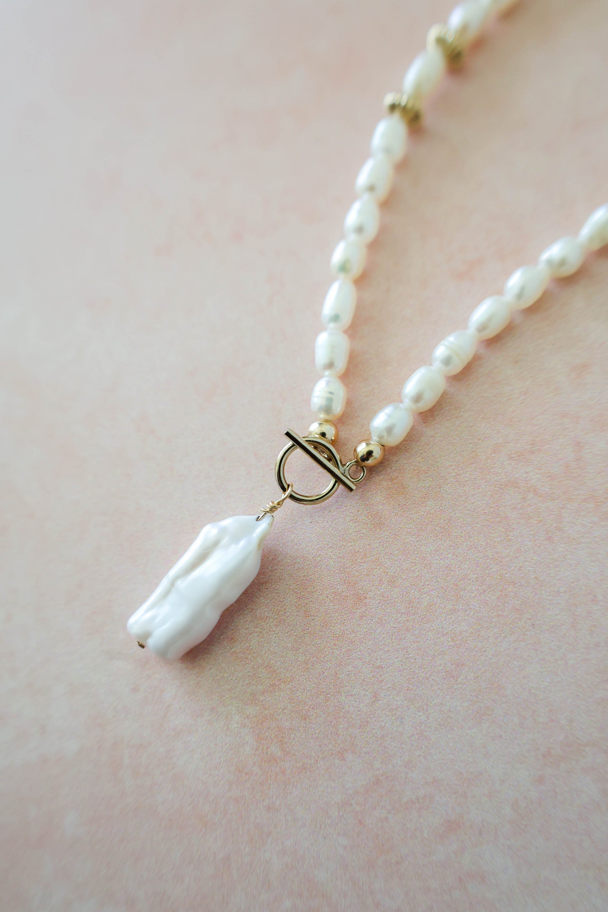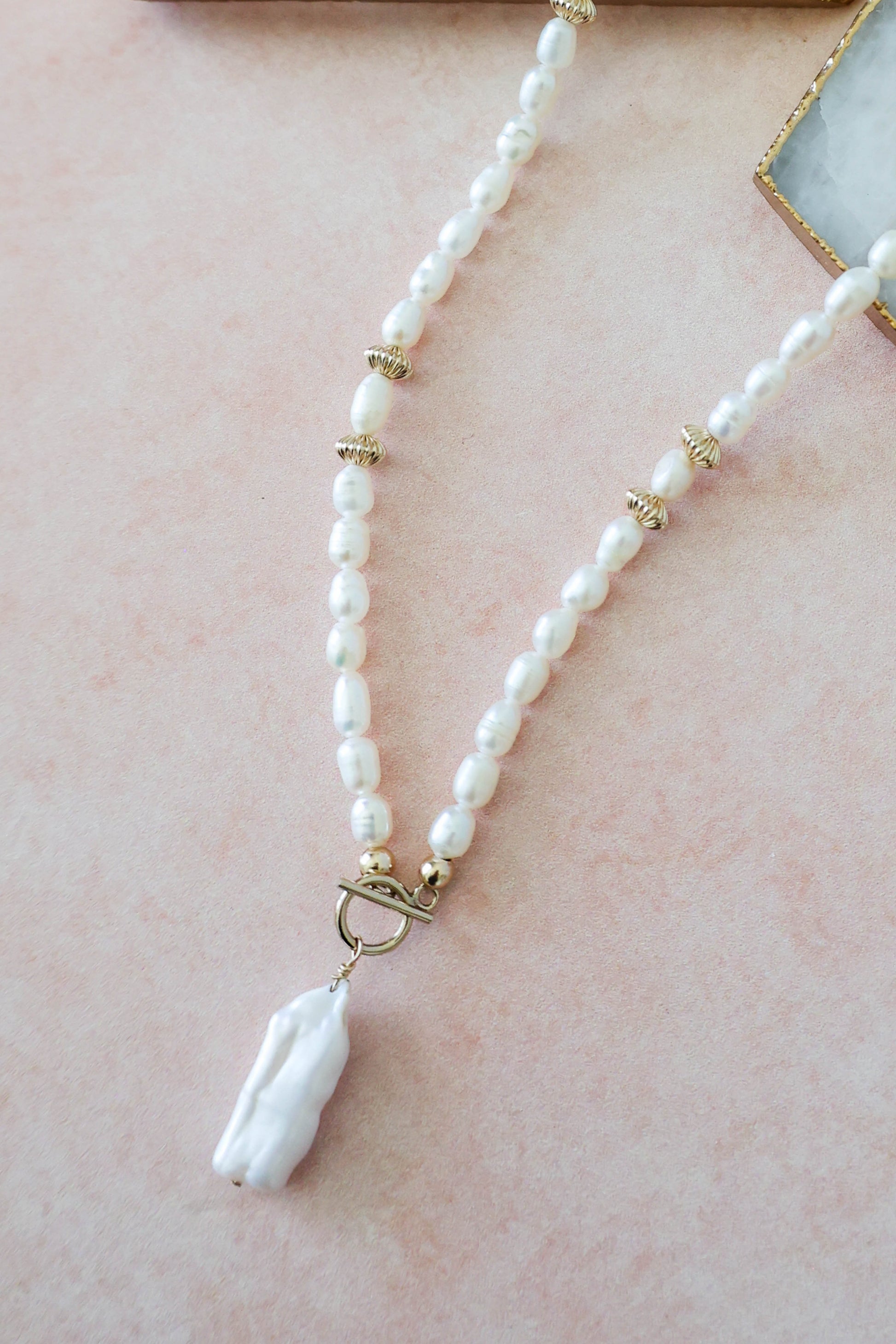 Pearl girls, this one is for you! Here to make a statement of elegance and class, this piece is handcrafted with natural freshwater pearls, corrugated gold saucer bead detail and a toggle clasp that drops a stunning one of a kind Biwa pearl. Wear it alone to stand out for a wedding or special occasion or layer it up for a classic but edgy vibe. Pearls are having a moment, and this necklace is here for it!