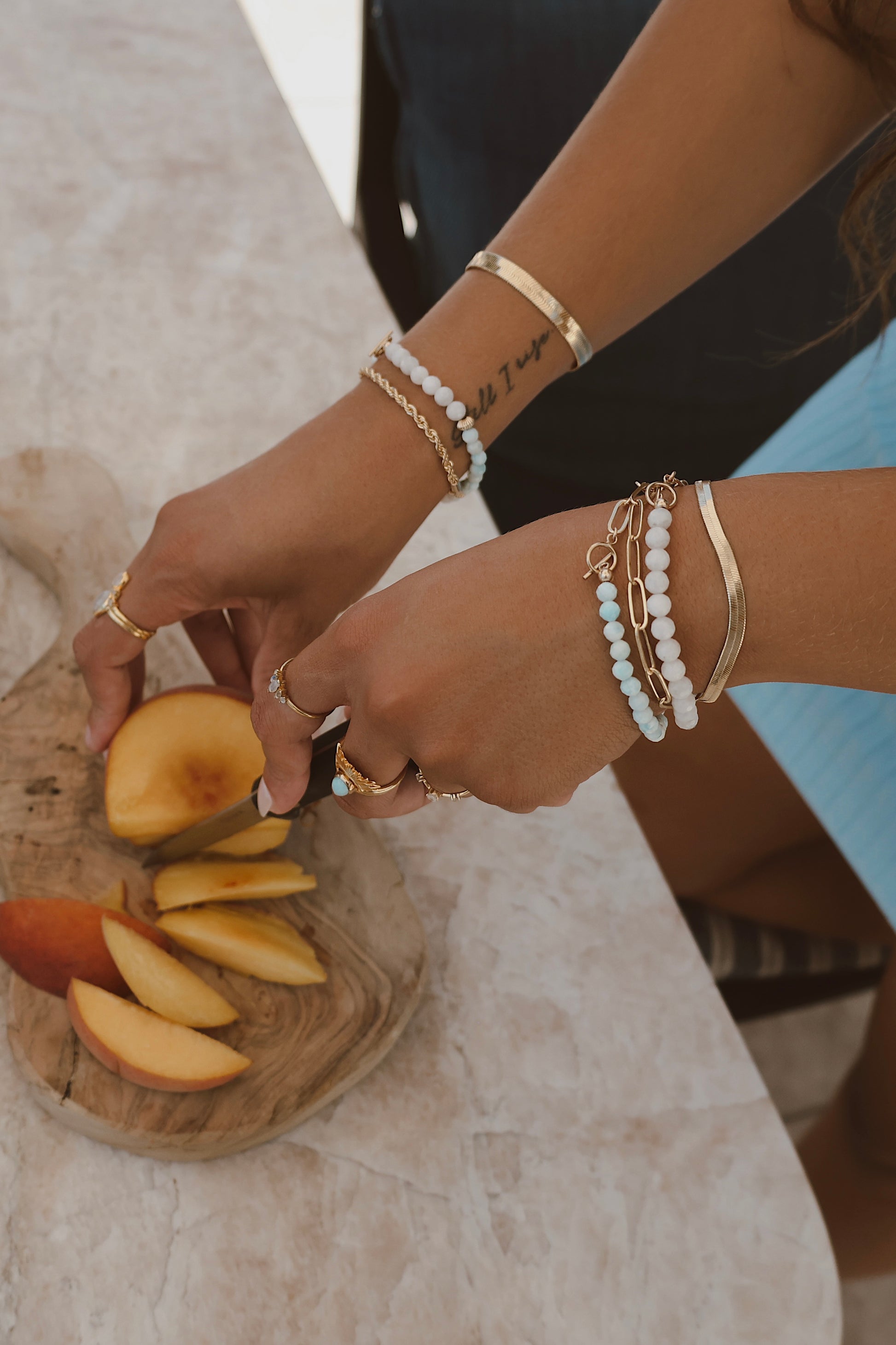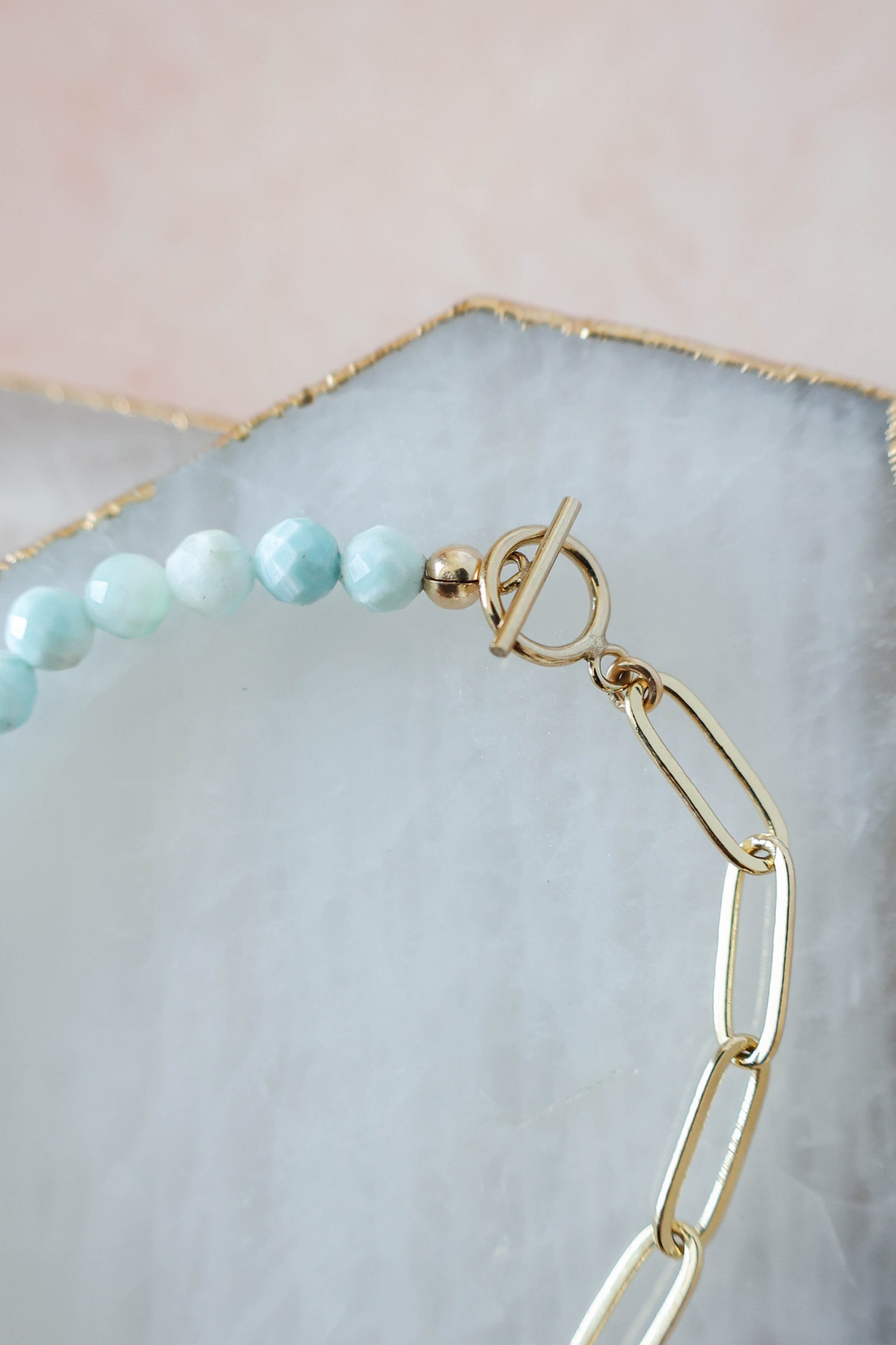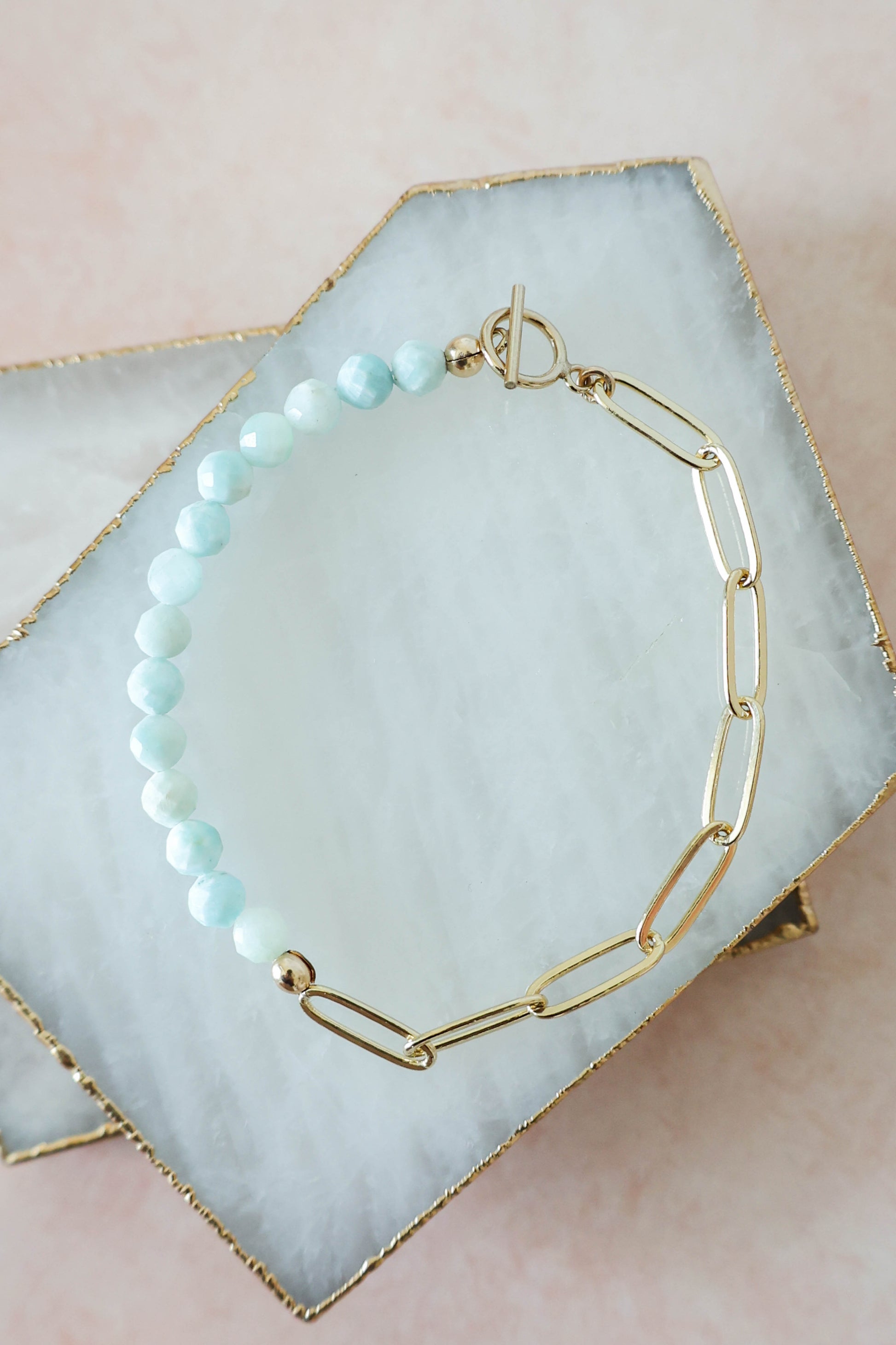 The best of both worlds, part beaded part paperclip chain. This bracelet is handcrafted with natural Larimar beads and our favorite paperclip chain with toggle clasp closure. Elevate your stack with the perfect duo.