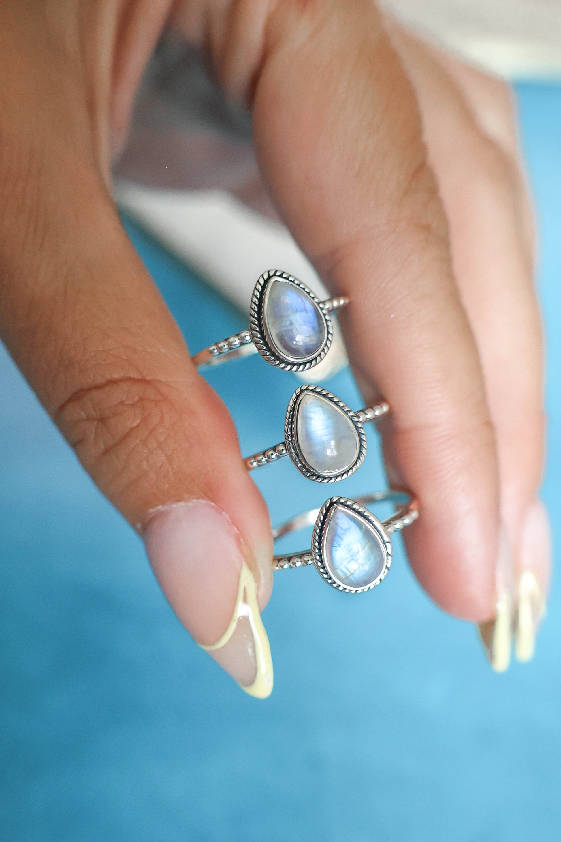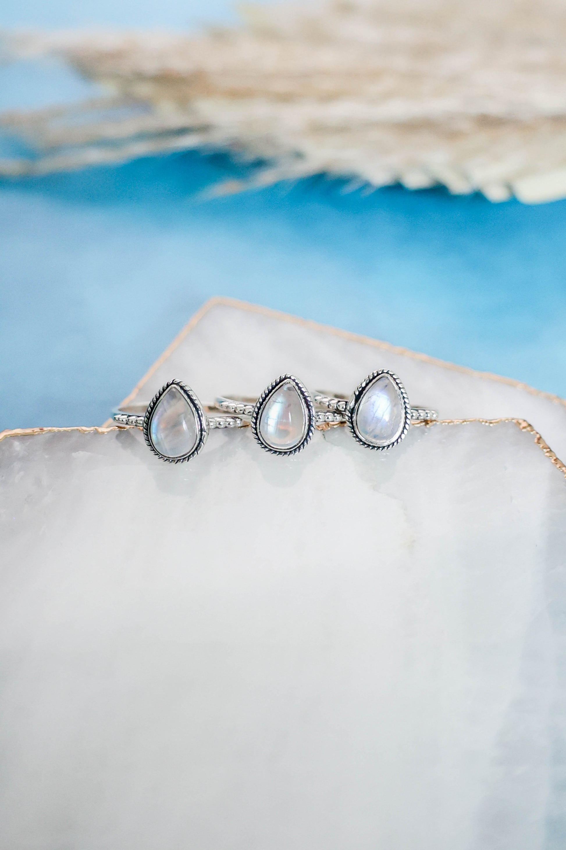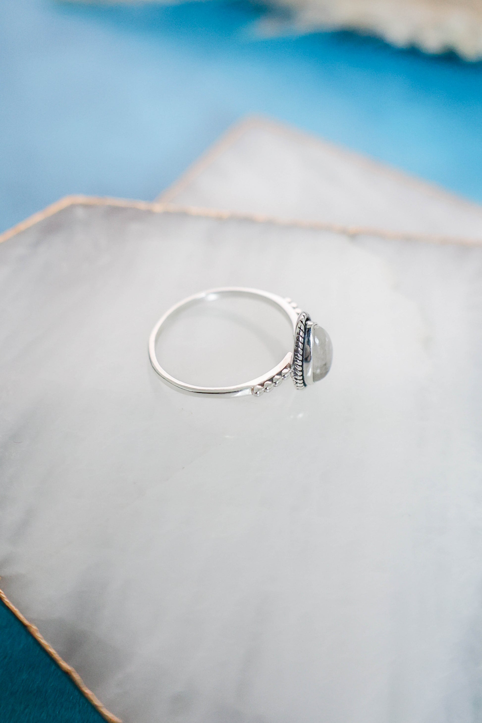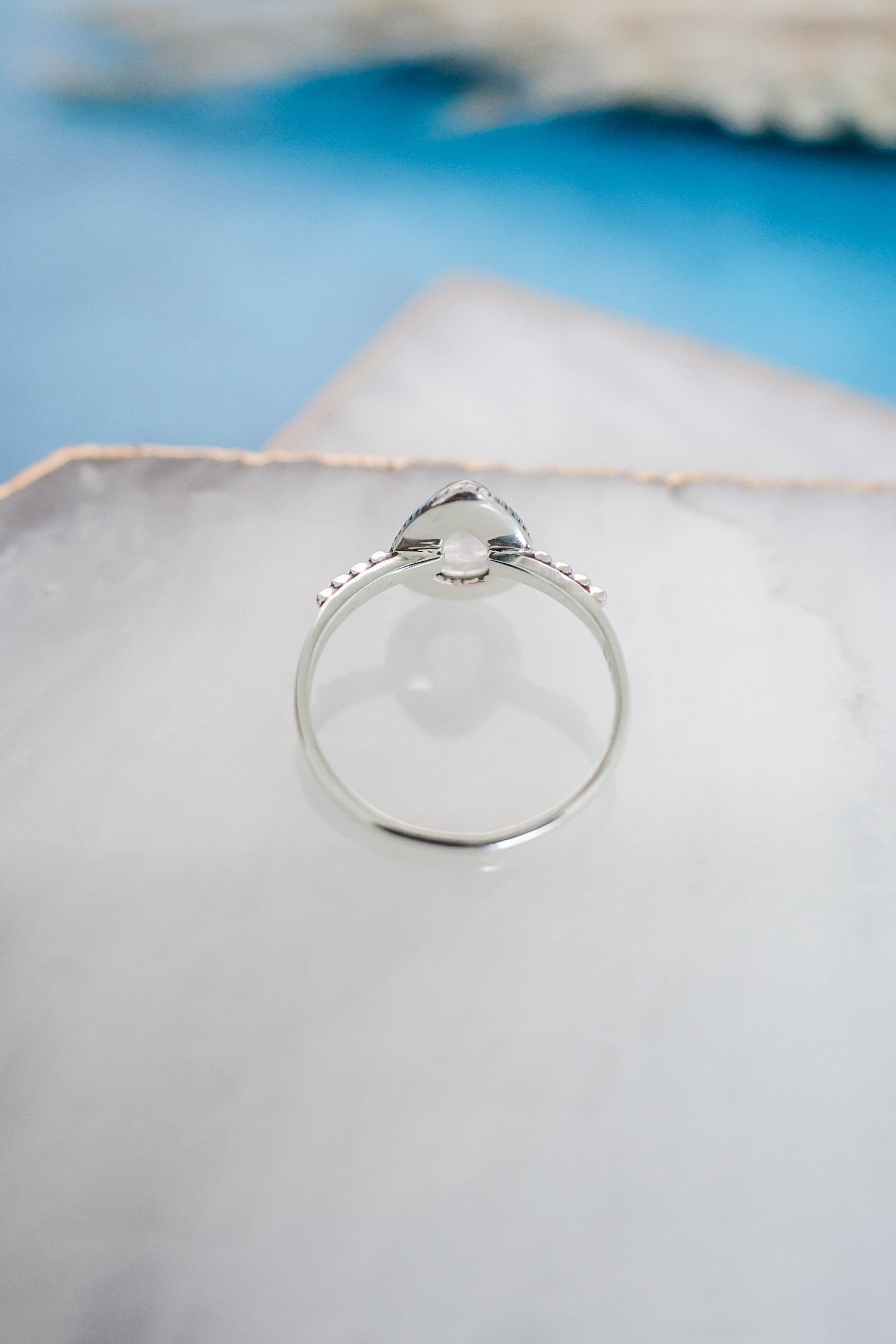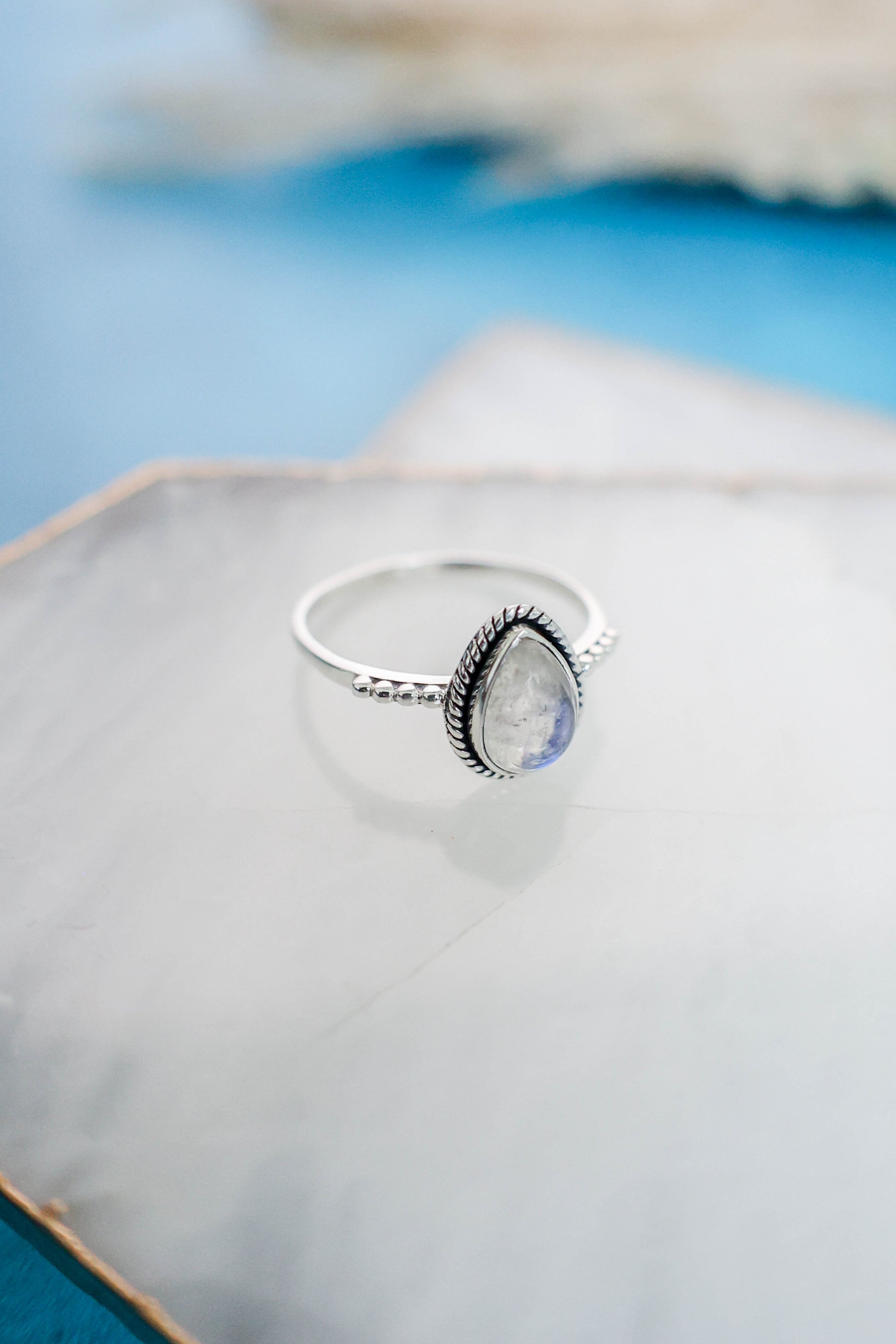 The perfect simple but cute, all day, every day ring! This dainty pear shaped rainbow moonstone ring with rope detailing surrounding the stone and a studded detail band is set in 925 sterling silver. This is one of our best sellers, so you can't go wrong with this cutie for you, or as a gift!