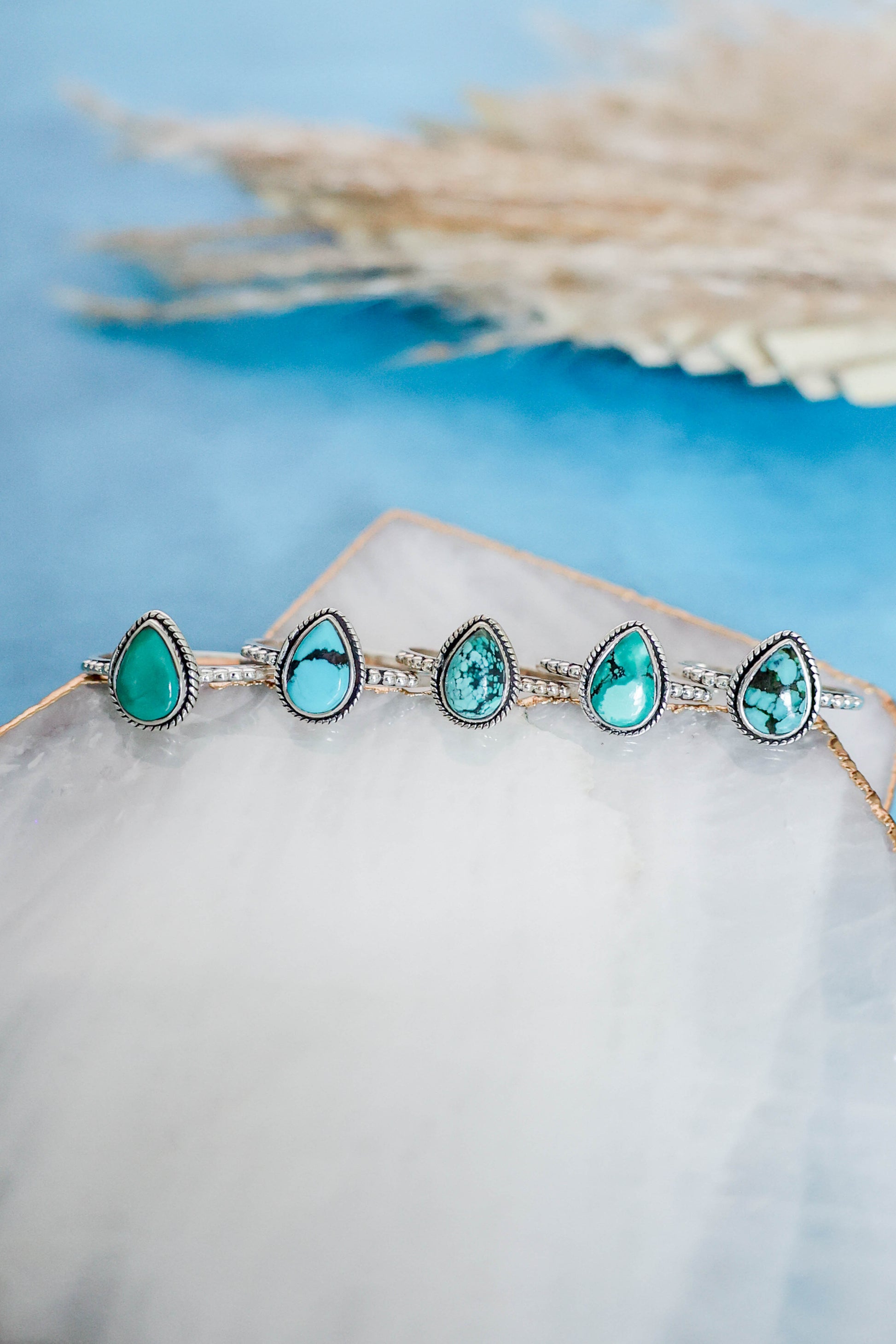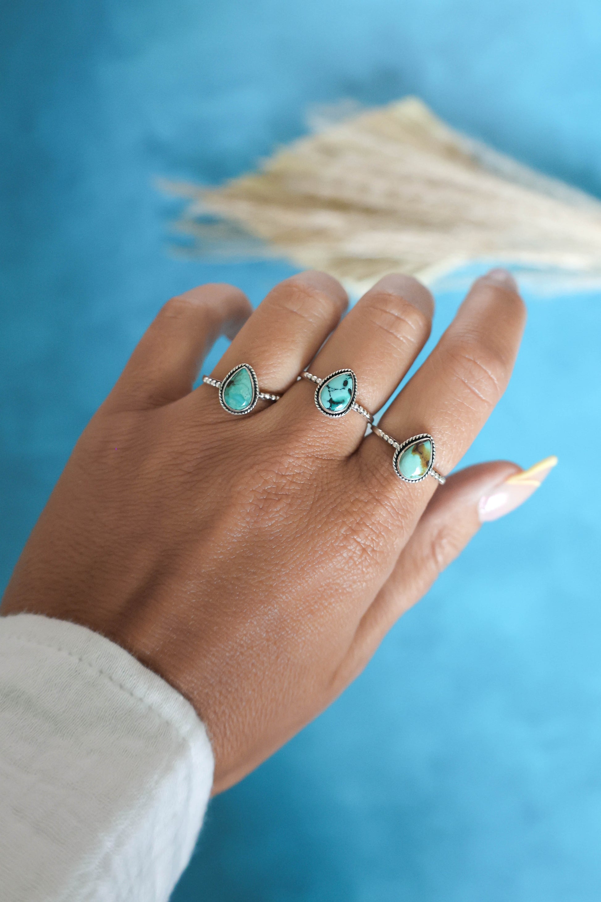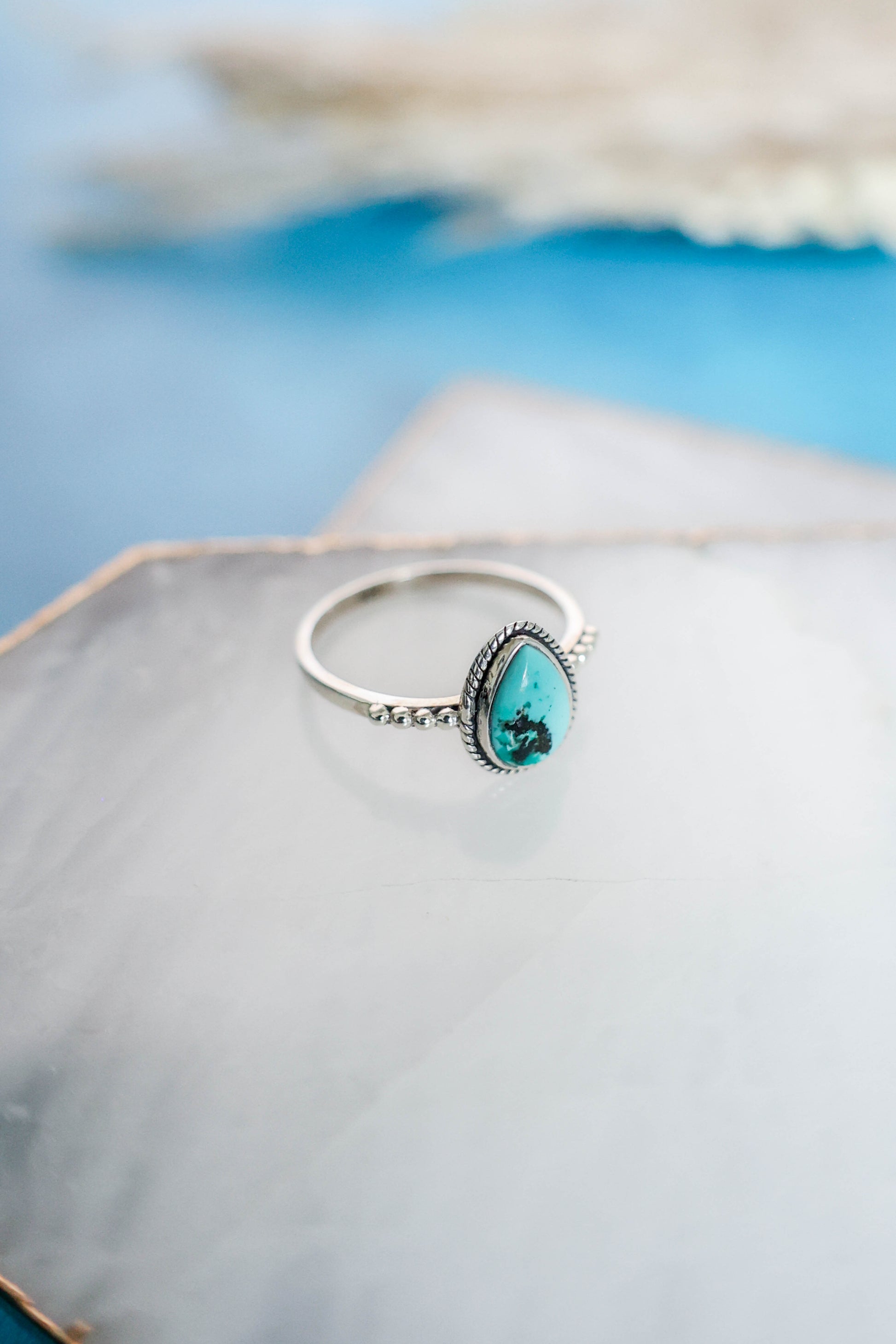 The perfect simple but cute, all day, every day ring! This dainty pear shaped genuine turquoise ring with rope detailing surrounding the stone and a studded detail band is set in 925 sterling silver. This is one of our best sellers, so you can't go wrong with this cutie for you, or as a gift!