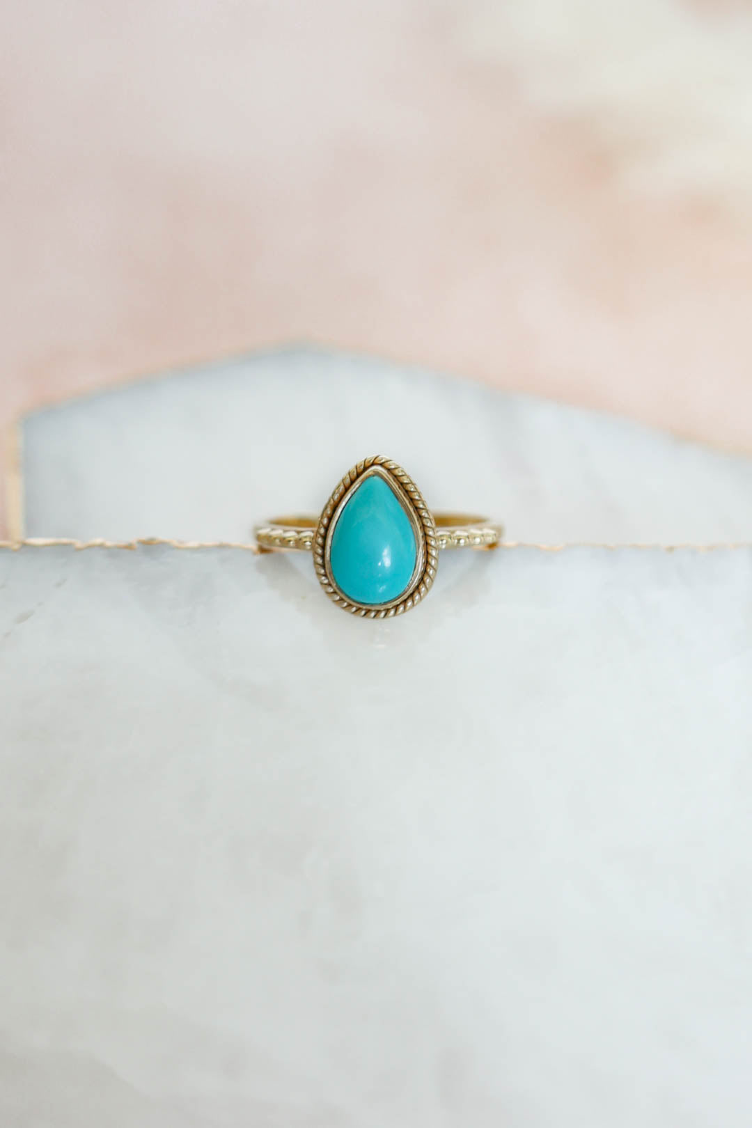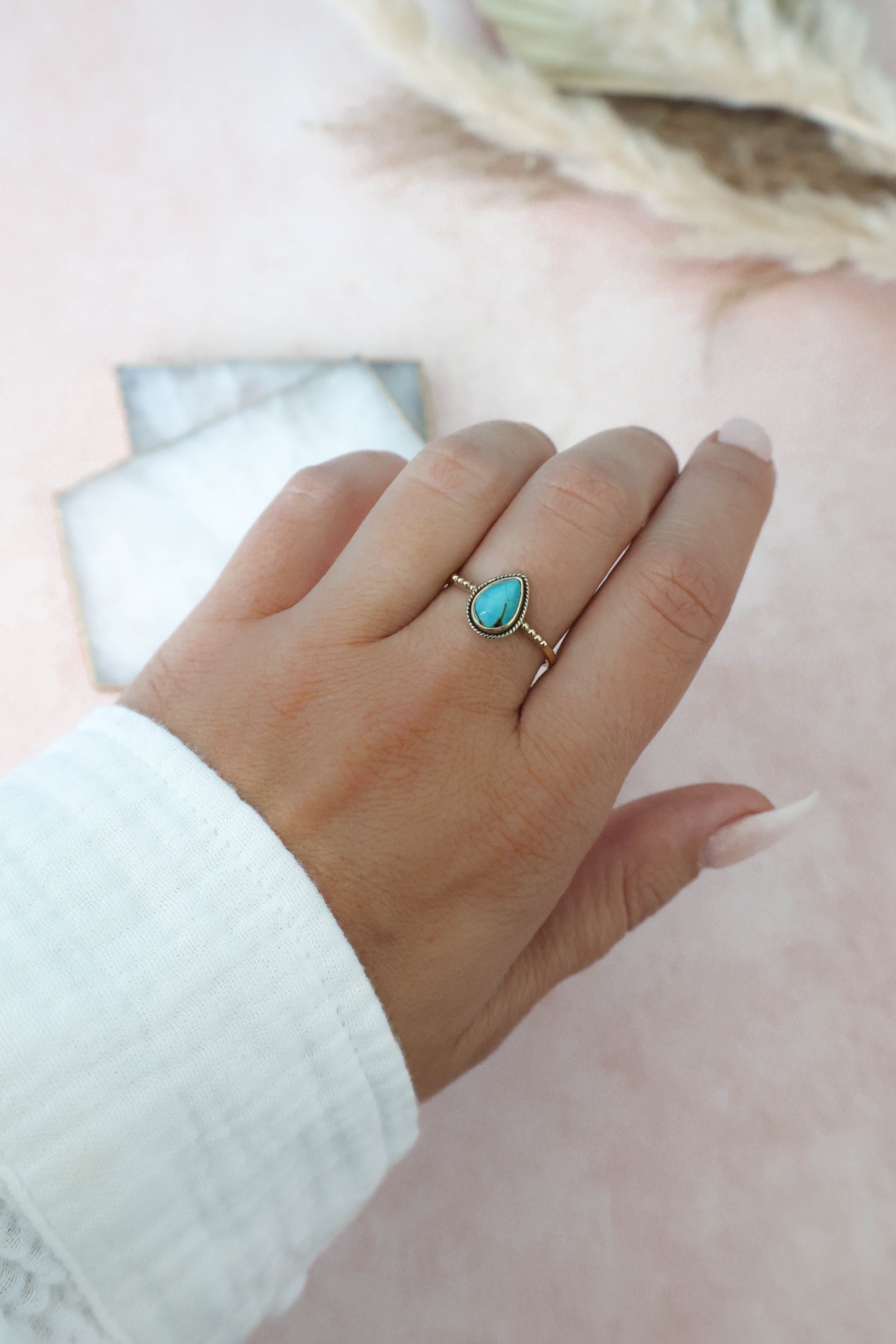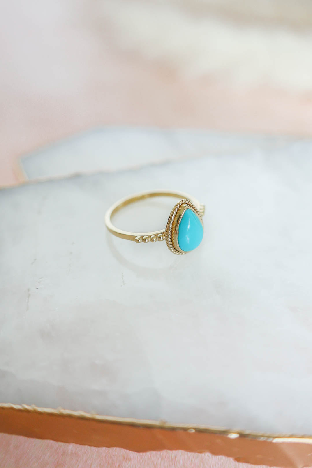The perfect simple but cute, all day, every day ring! This dainty pear shaped Turquoise ring with rope detailing surrounding the stone and a studded detail band is set in 14k gold vermeil. This is one of our best sellers, so you can't go wrong with this cutie for you, or as a gift!