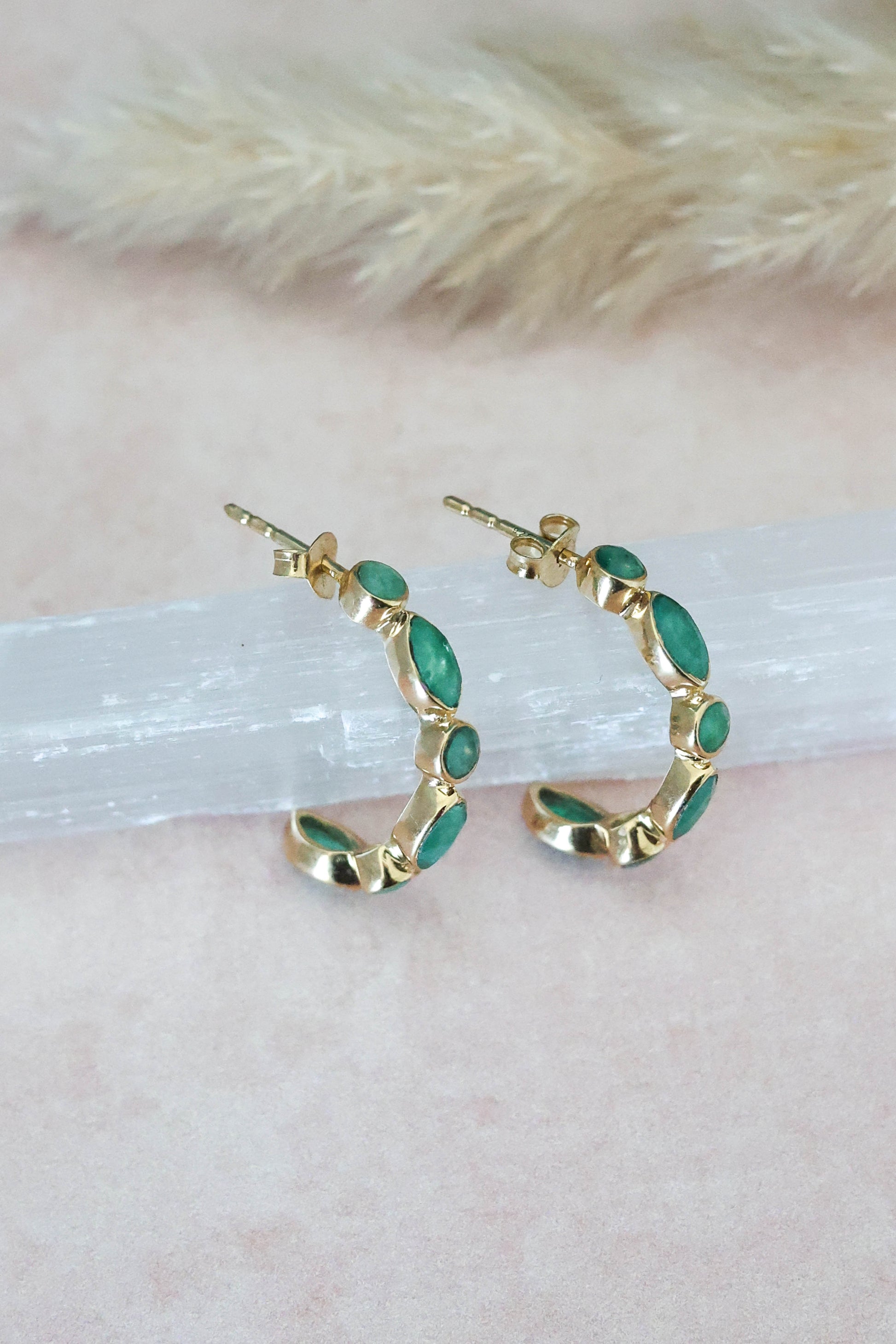 It's all in the details and these earrings have it all figured out. These dainty emerald half hoops set in 14k gold vermeil are ready to fit right into your ear stack. Their marquise stones between two dainty round stones give it dimension and a unique look, while still staying minimal and simple. Make these a matching set with the 'Olivia Ring' to complete your look!