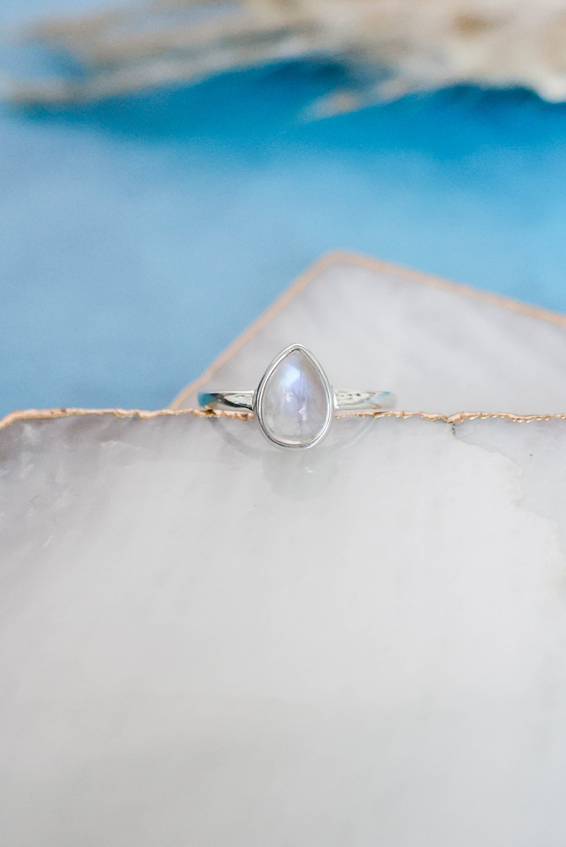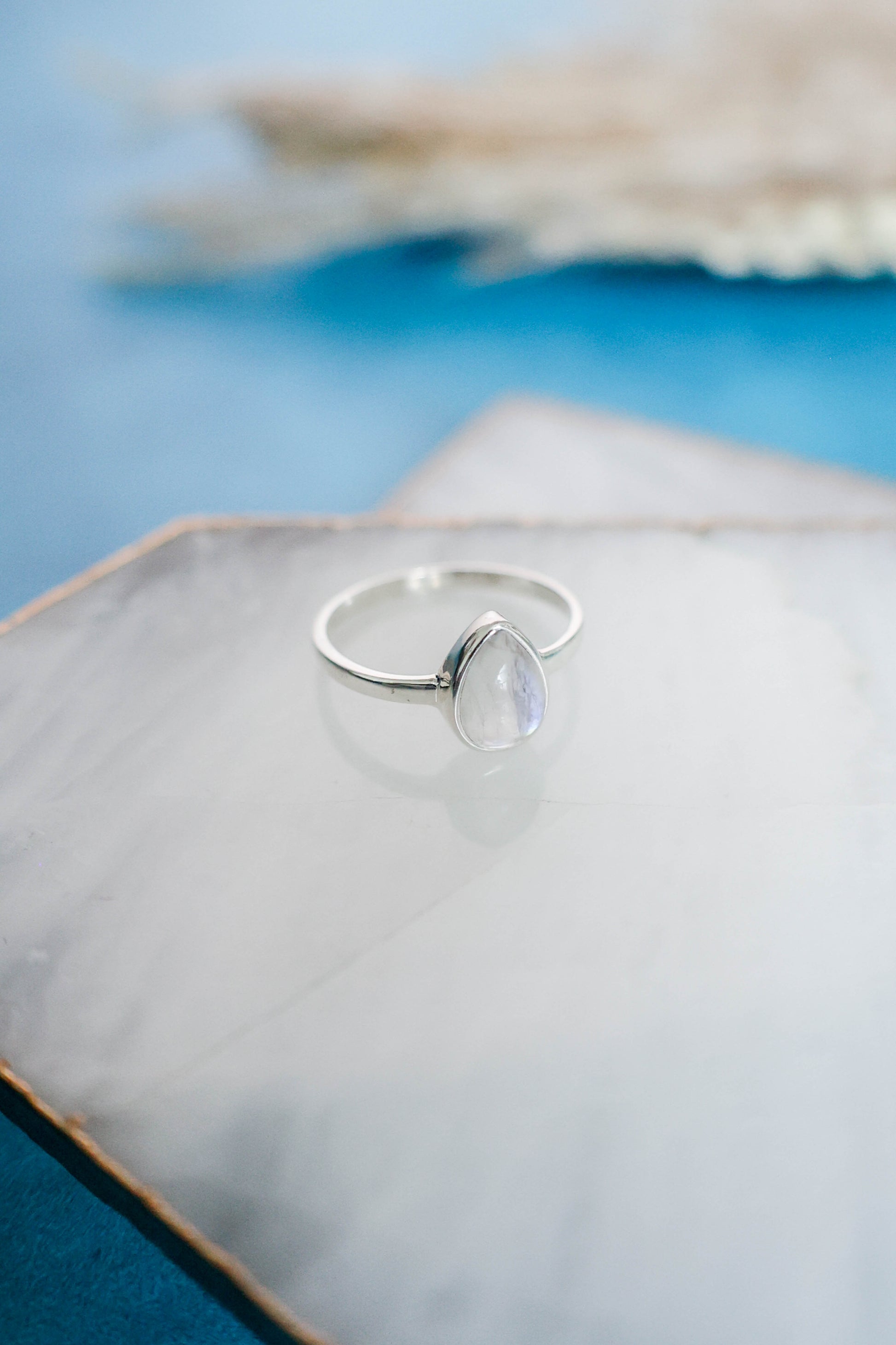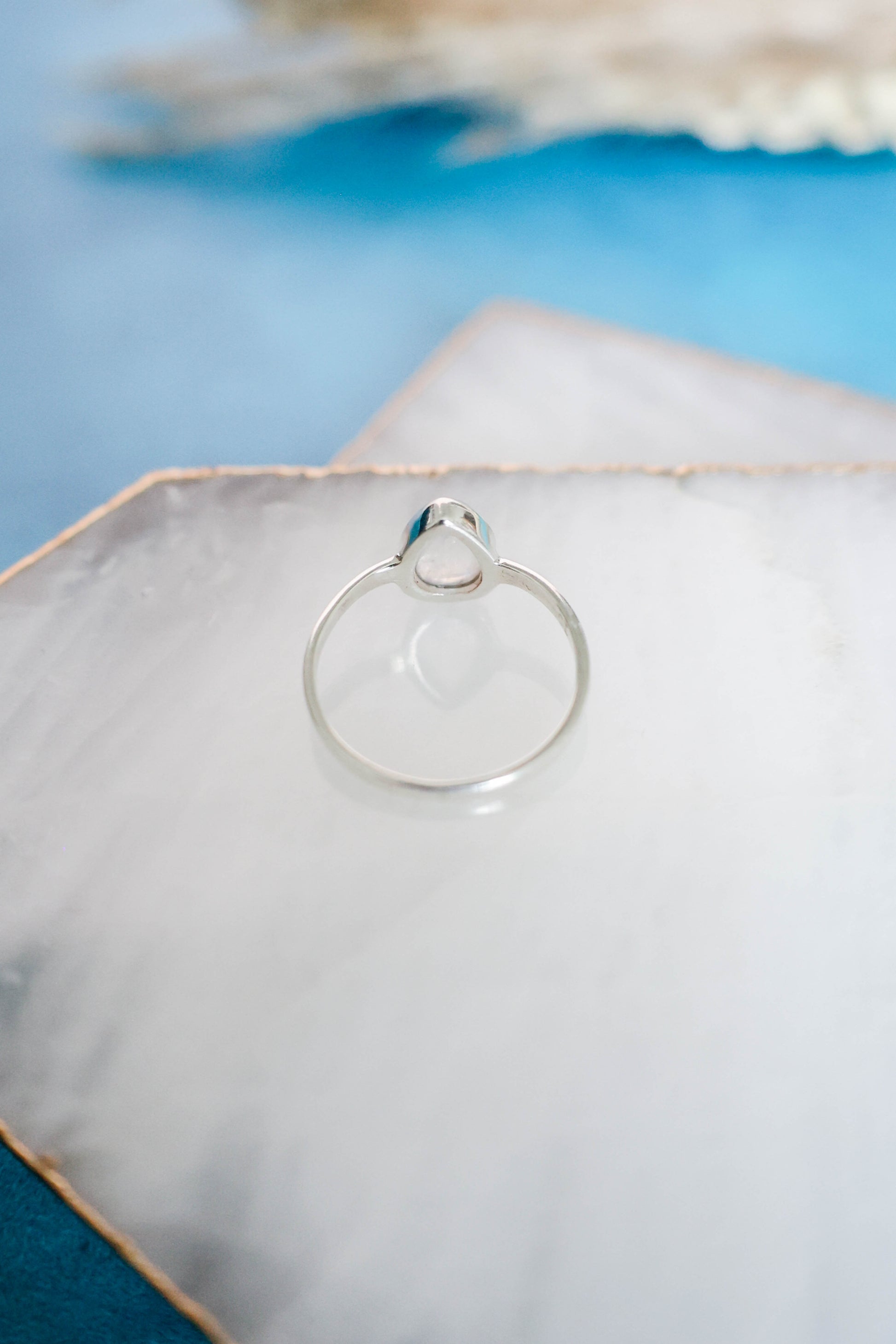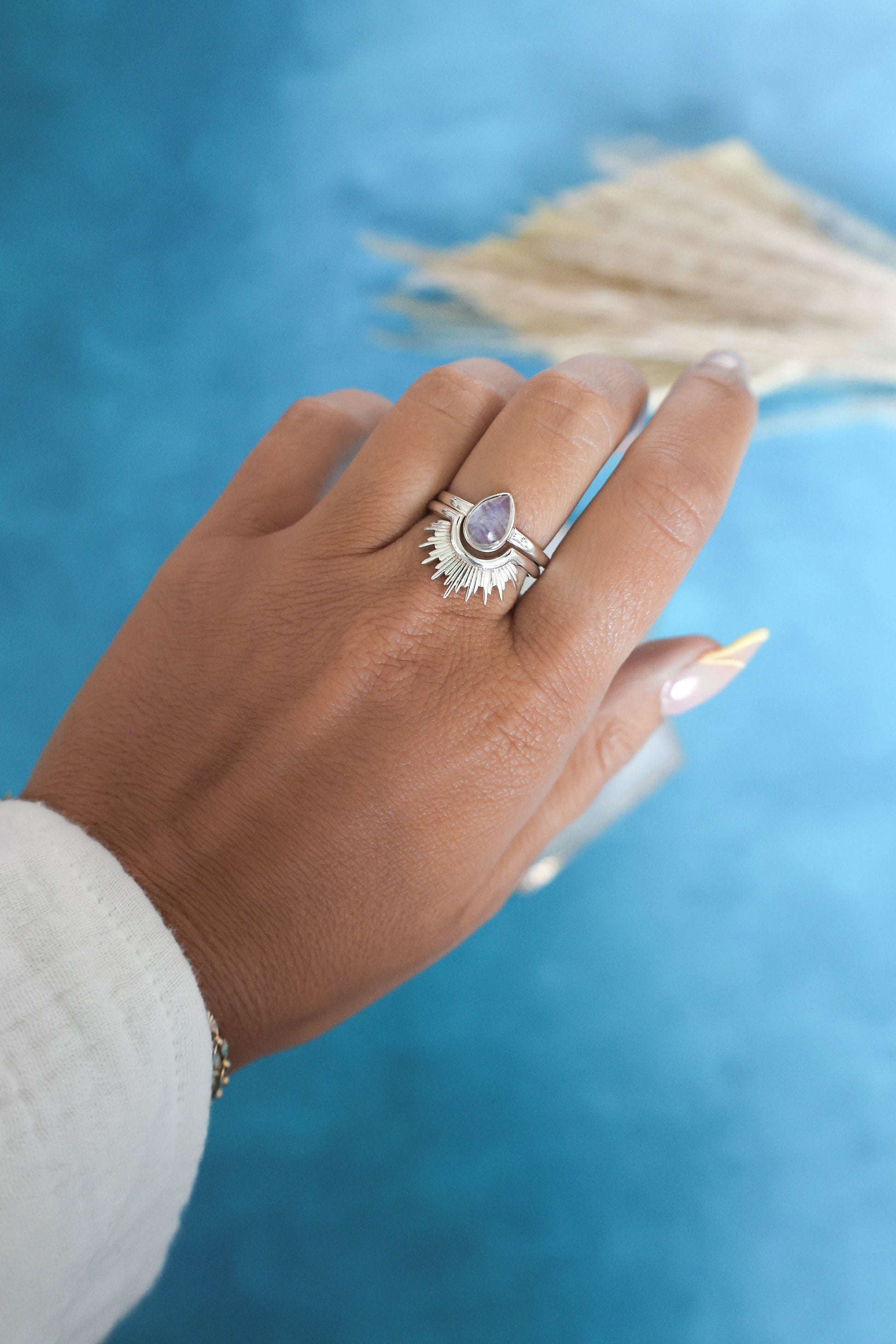 Dainty stackable Rainbow Moonstone ring set in 925 sterling silver. Wear this ring on its own or pair it with others. Add the 'Sole Ring' for a gorgeous sun inspired stacked look as shown in the photos!