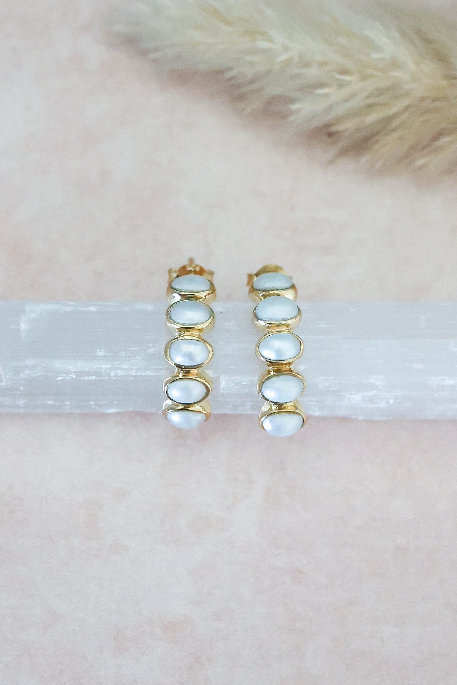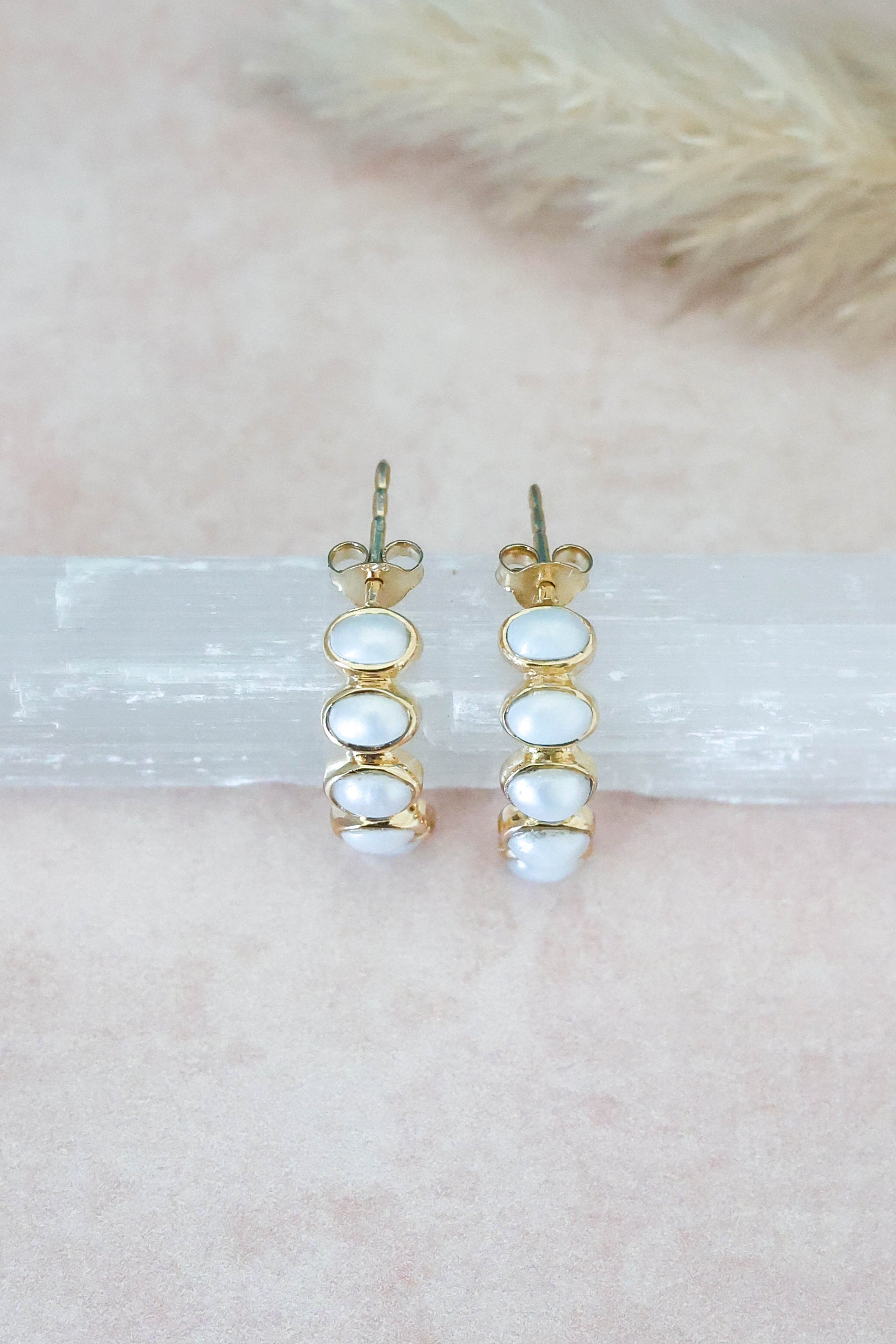 The must have half hoops! These multi-stone pearl earrings are set in 14k gold vermeil and we must say, you're going to love these. She's comfortable, cute, and will fit right into your ear stack. Make these a matching set with the 'Nova Ring' to complete your look!