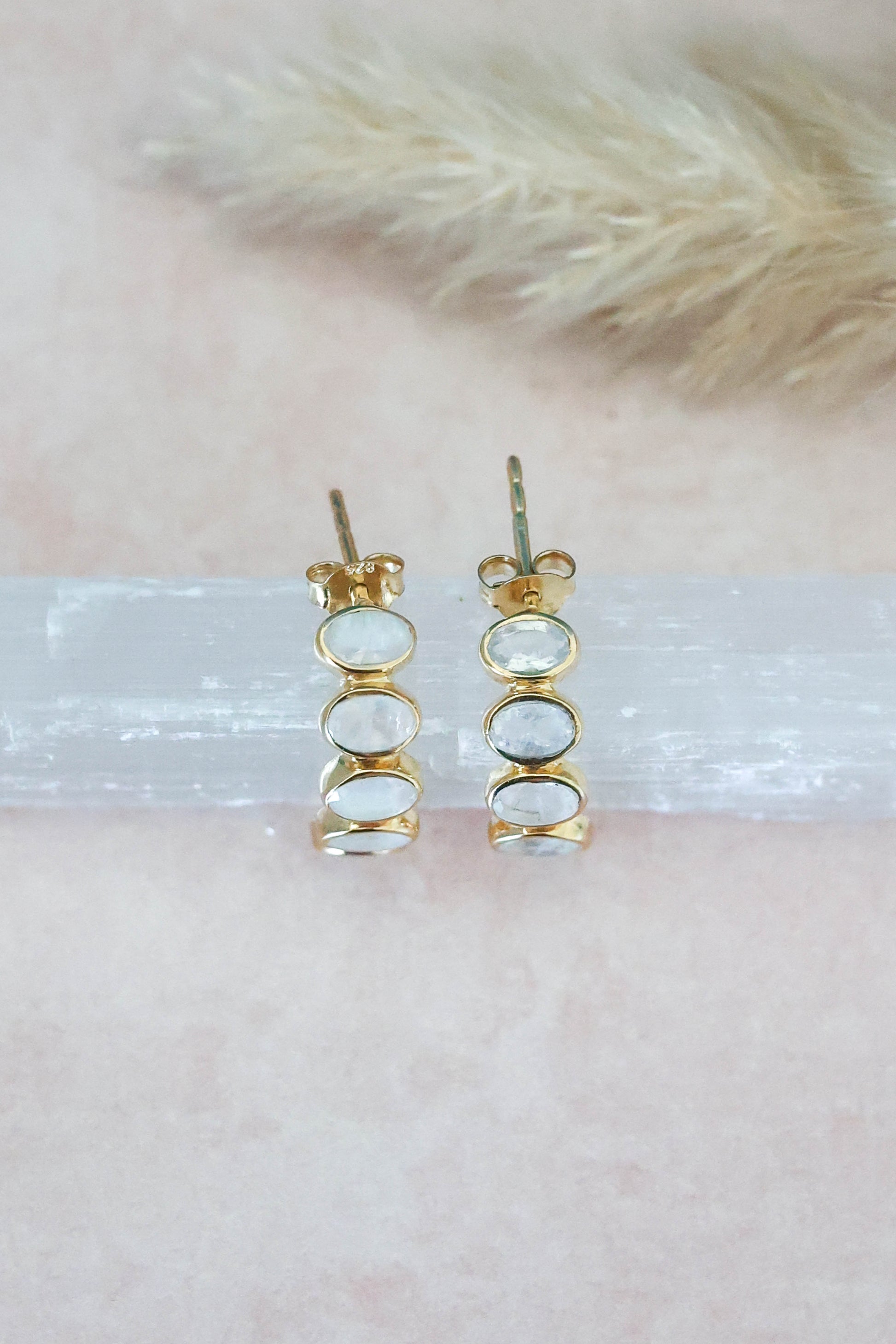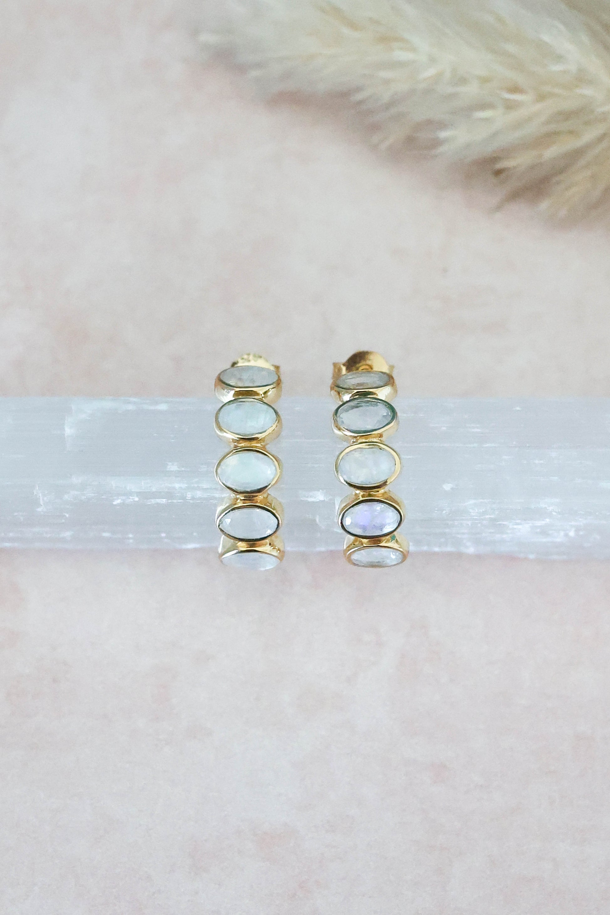 The must have half hoops! These multi-stone rainbow moonstone earrings are set in 14k gold vermeil and we must say, you're going to love these. She's comfortable, cute, and will fit right into your ear stack. Make these a matching set with the 'Nova Ring' to complete your look!