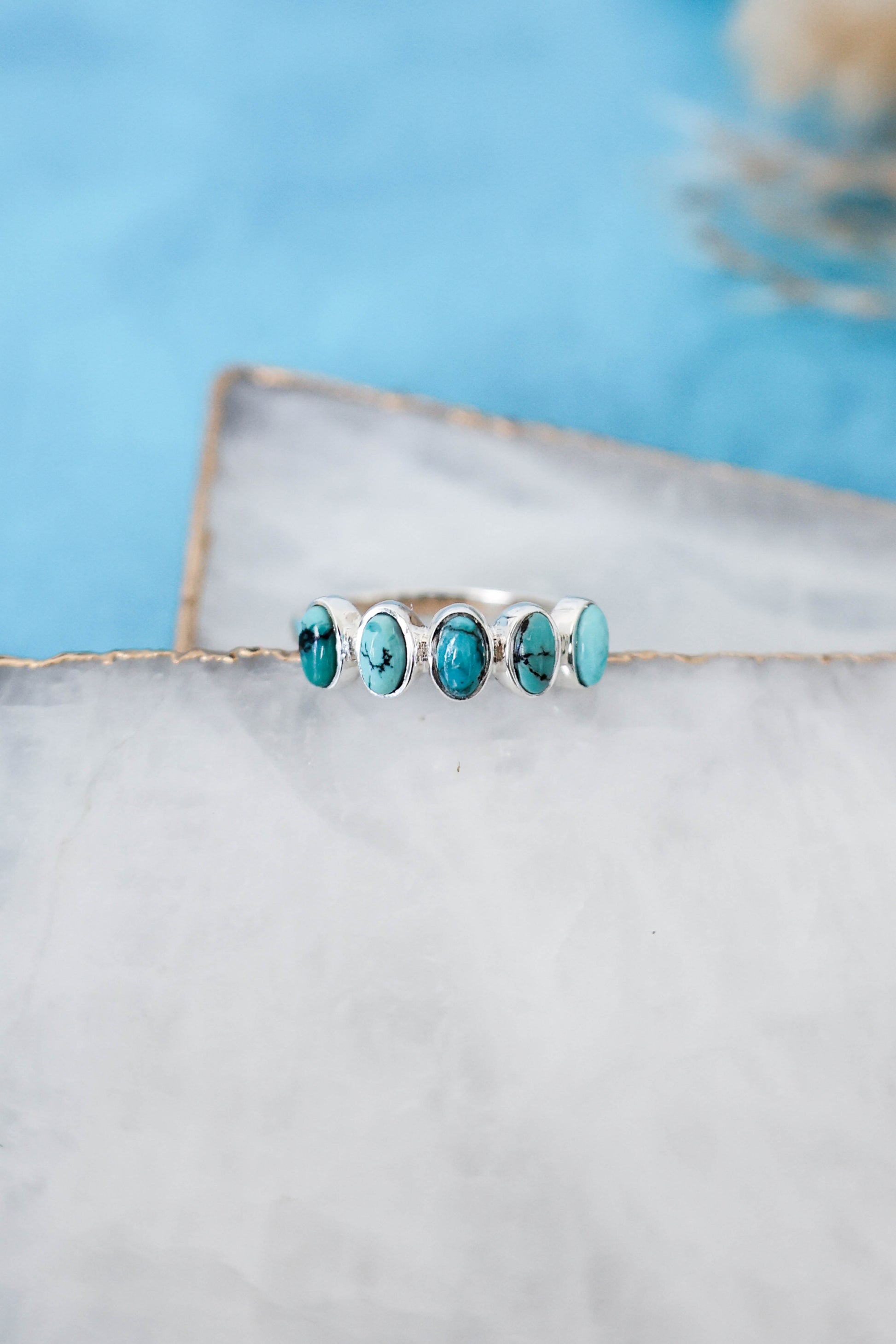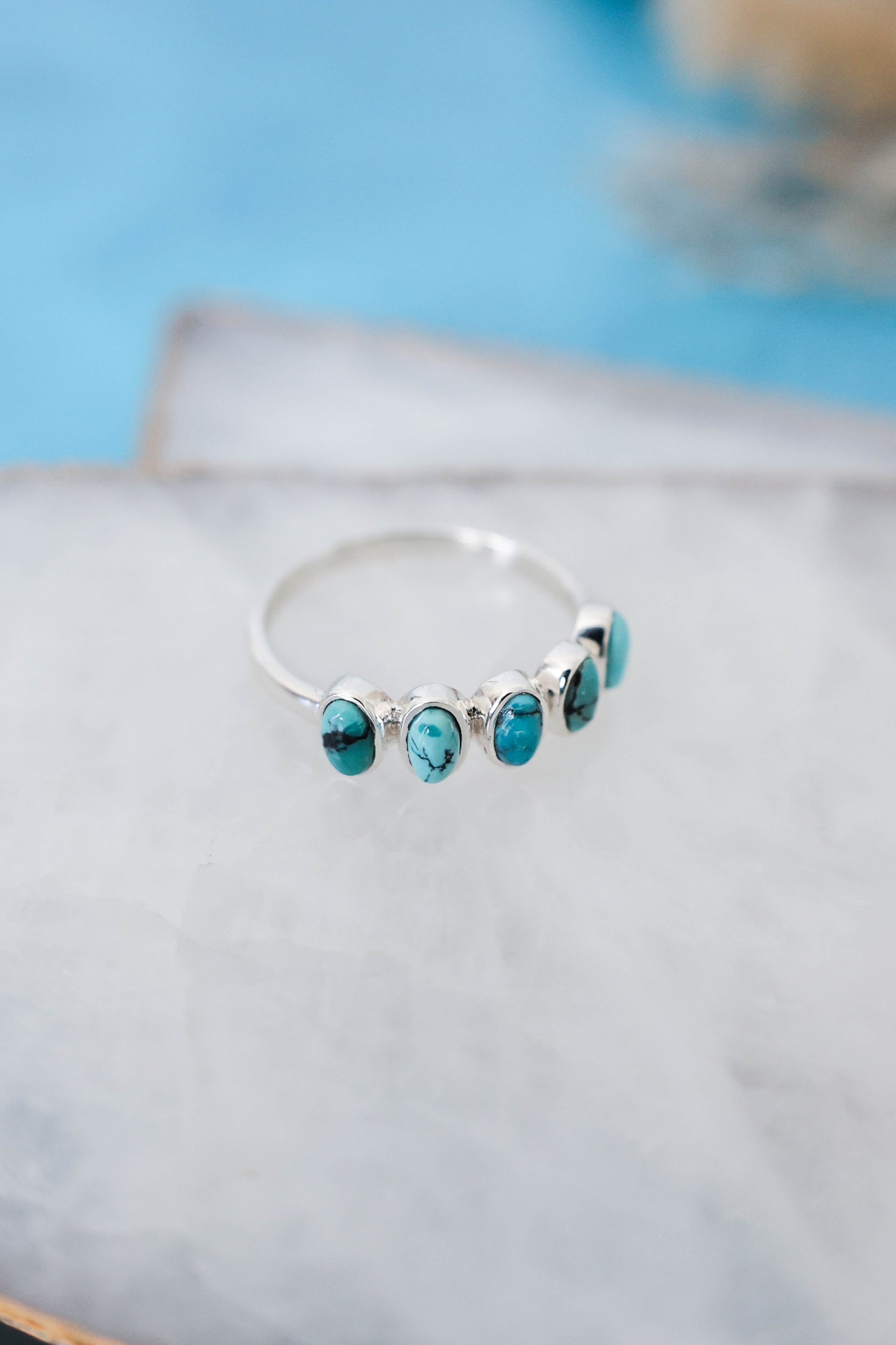 Why have one stone when you can have 5?! This multi stone turquoise ring is set in 925 sterling silver and we must say, you're going to love this one! She's comfortable, cute, and will fit right into your collection.