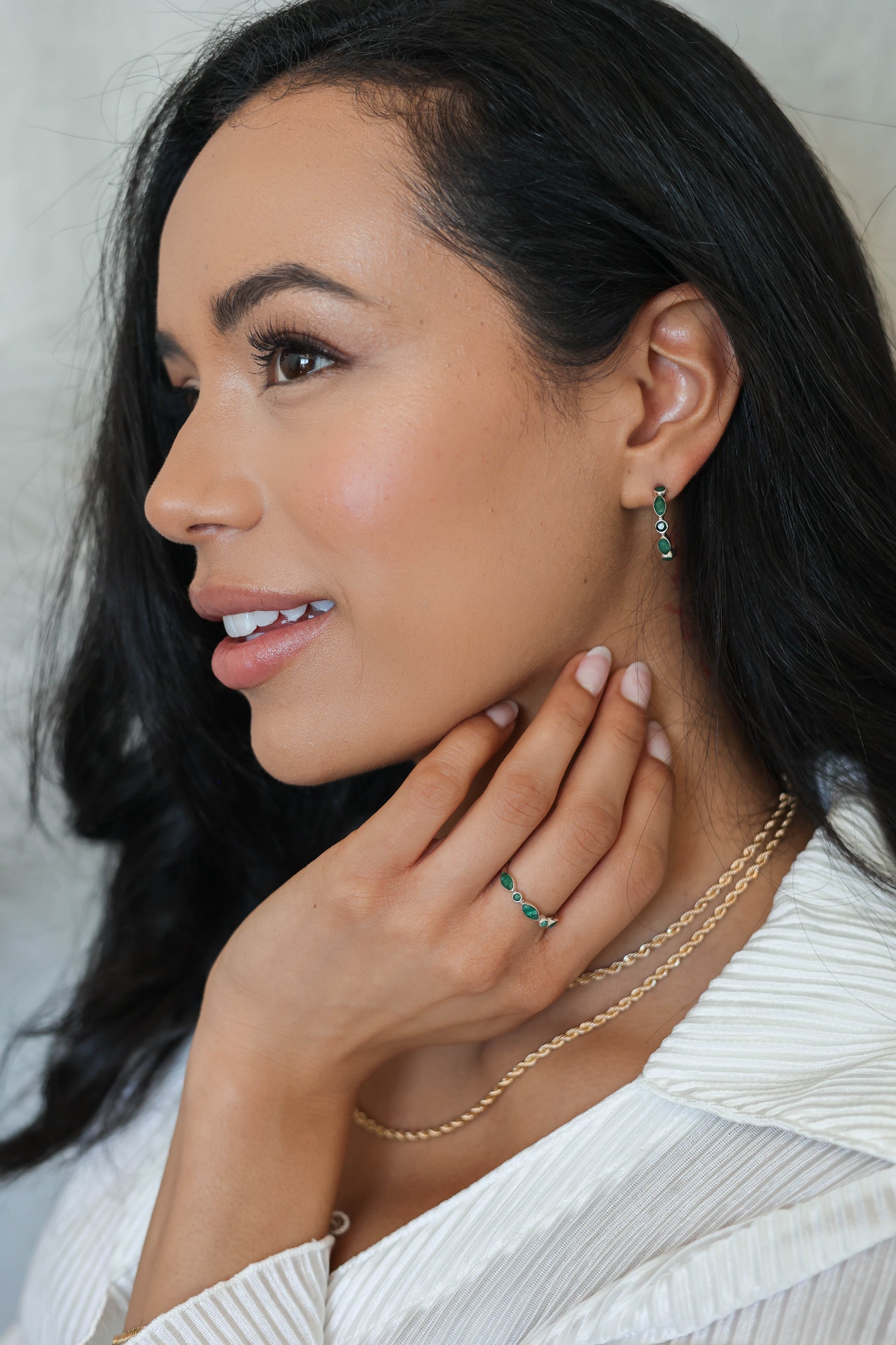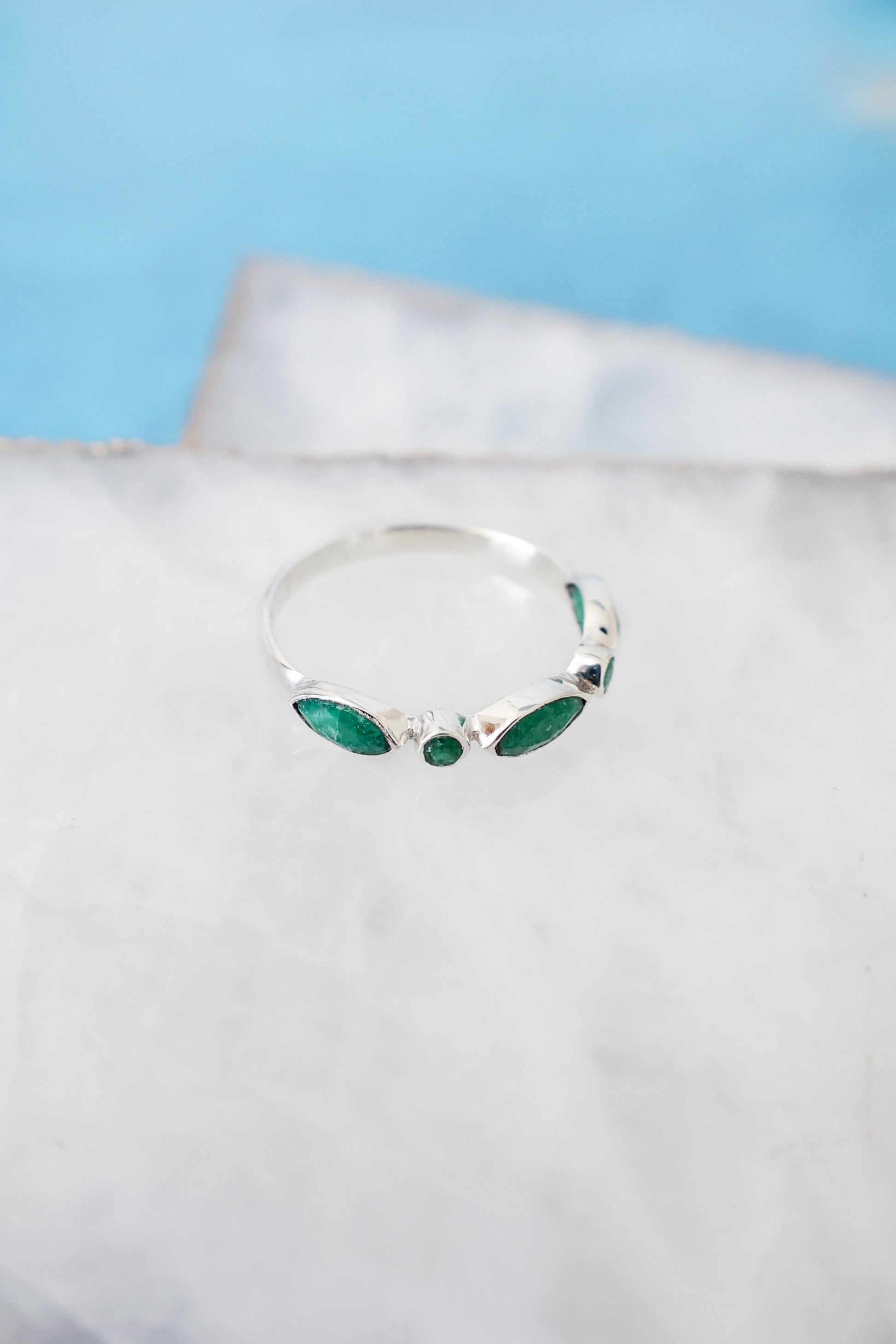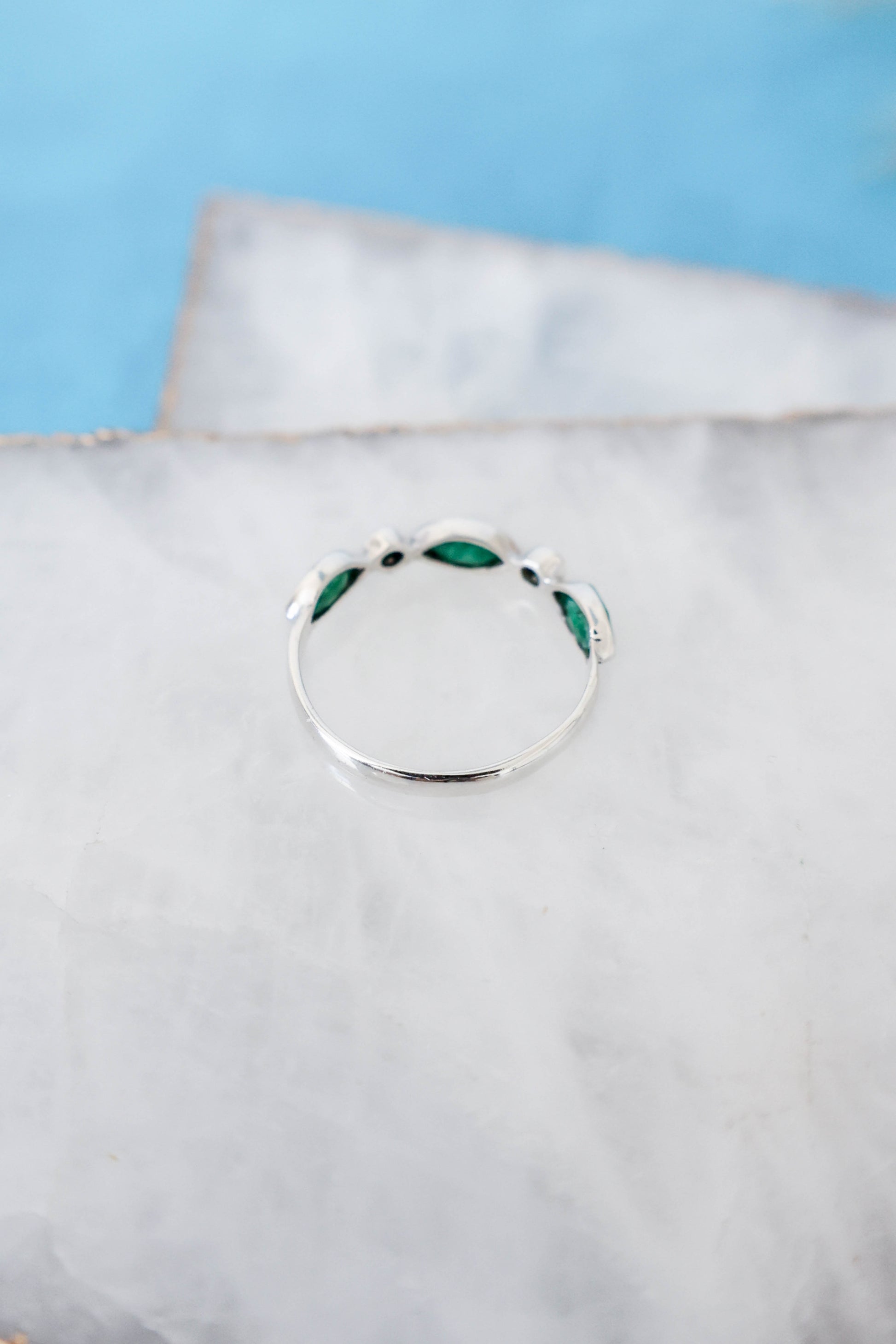 It's all in the details and this ring has it all figured out. This dainty emerald ring set in 925 sterling silver is ready to fit right into your stack. Its horizontal marquise stones between two dainty round stones give it dimension and a unique look, while still staying minimal and simple.