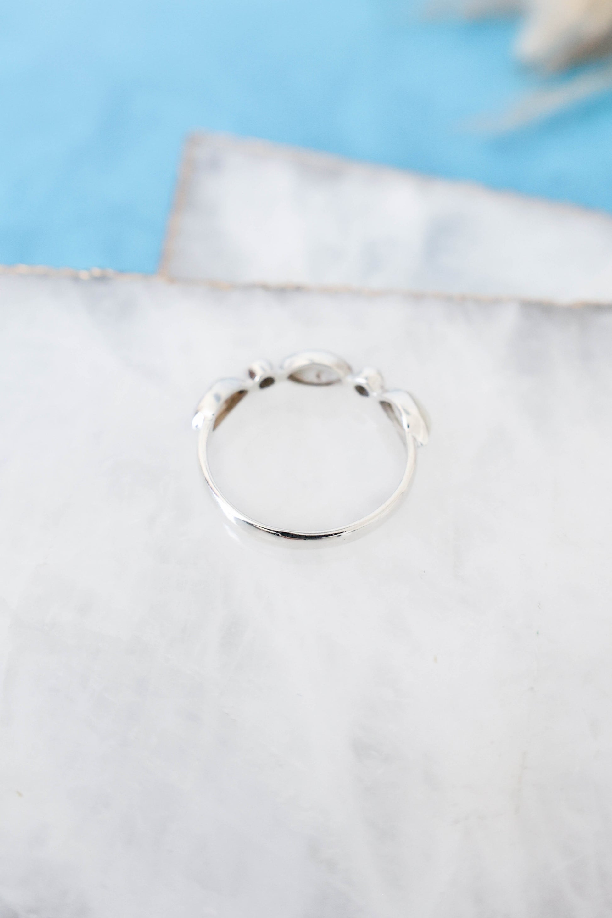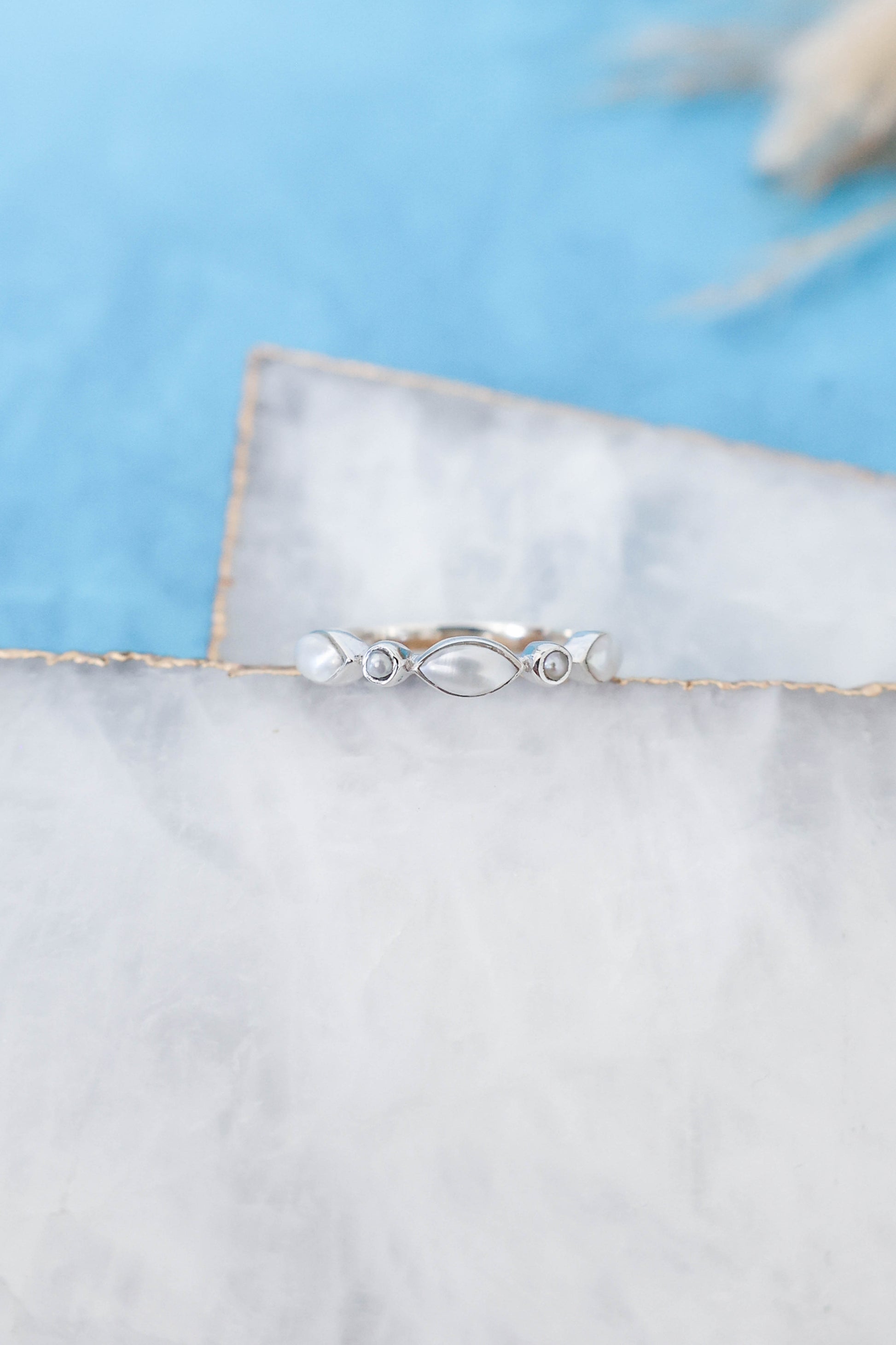 It's all in the details and this ring has it all figured out. This dainty pearl ring set in 925 sterling silver, is ready to fit right into your stack. Its horizontal marquise stones between two dainty round stones give it dimension and a unique look, while still staying minimal and simple.