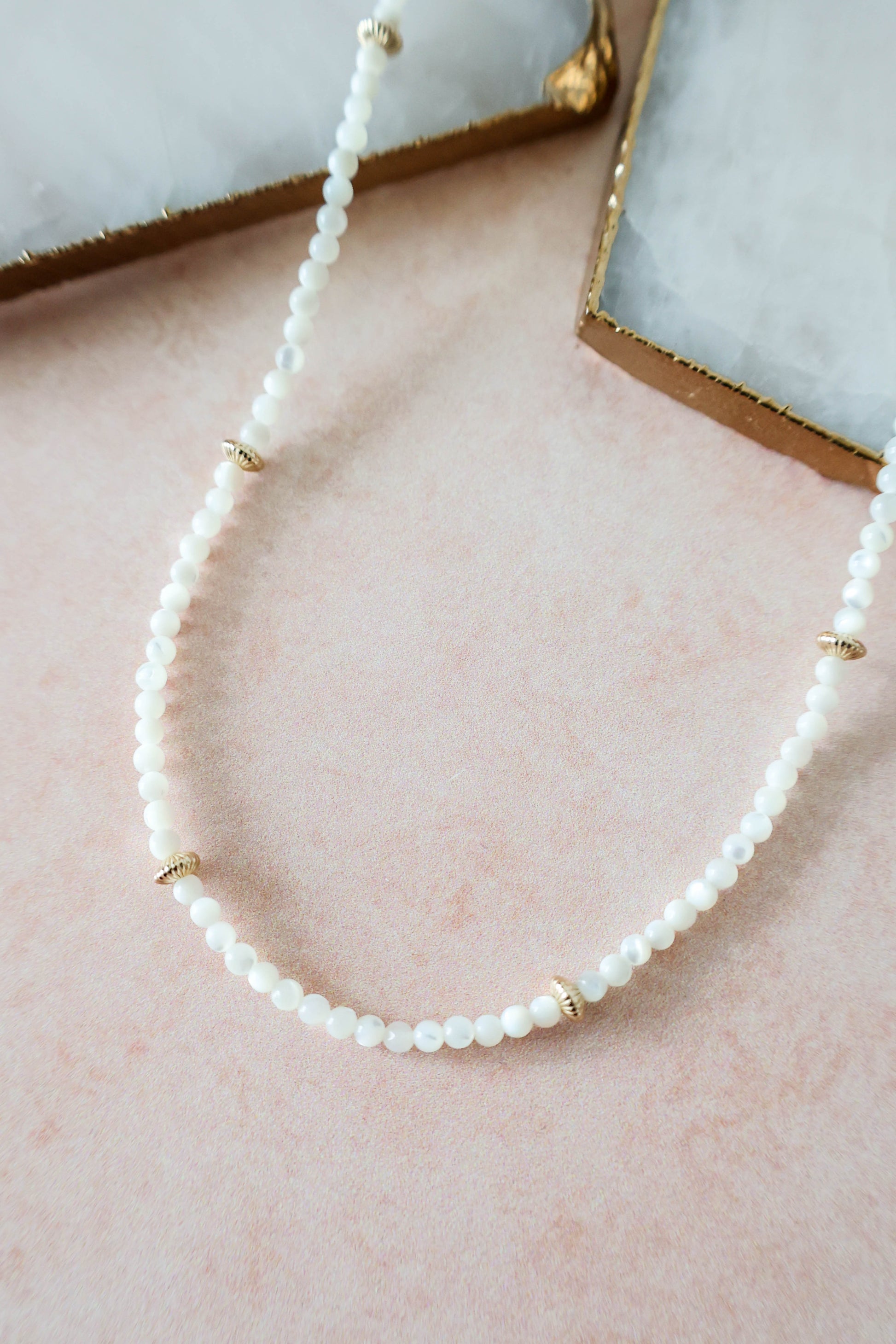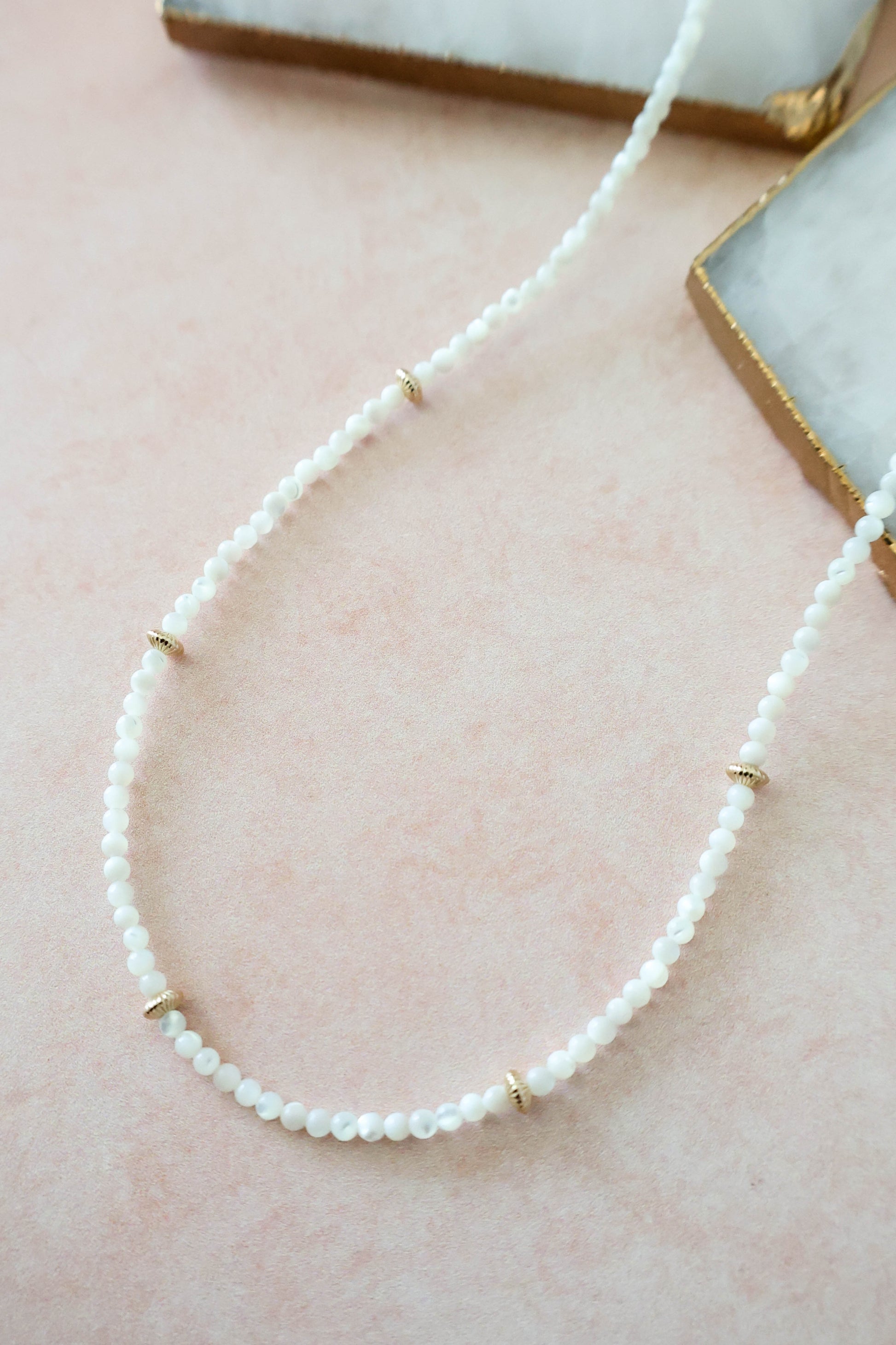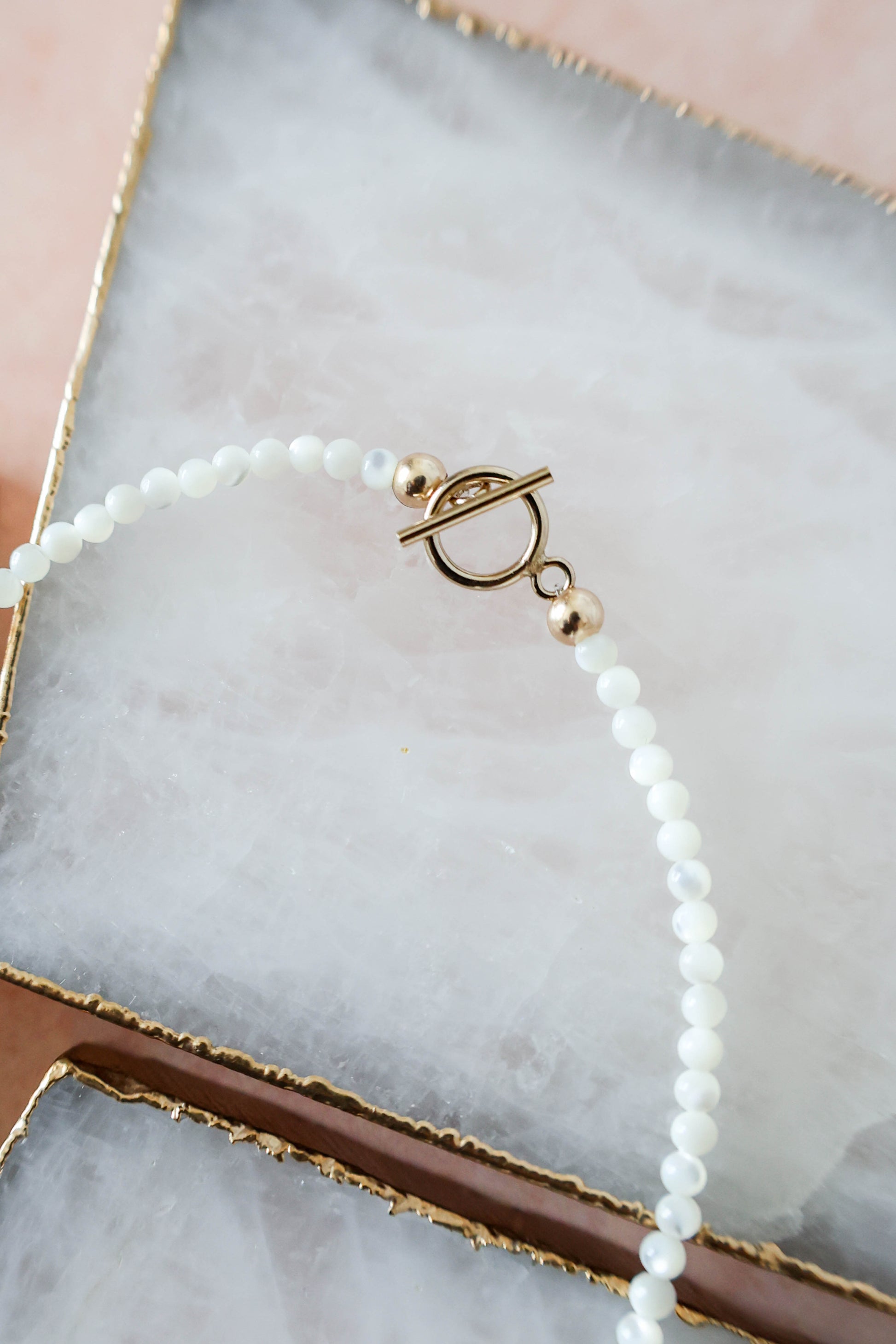 Light and bright beaded necklace handcrafted with mother of pearl beads, corrugated saucer beads and a toggle clasp. Layer up with a any gold necklace stack, it'll fit right in!