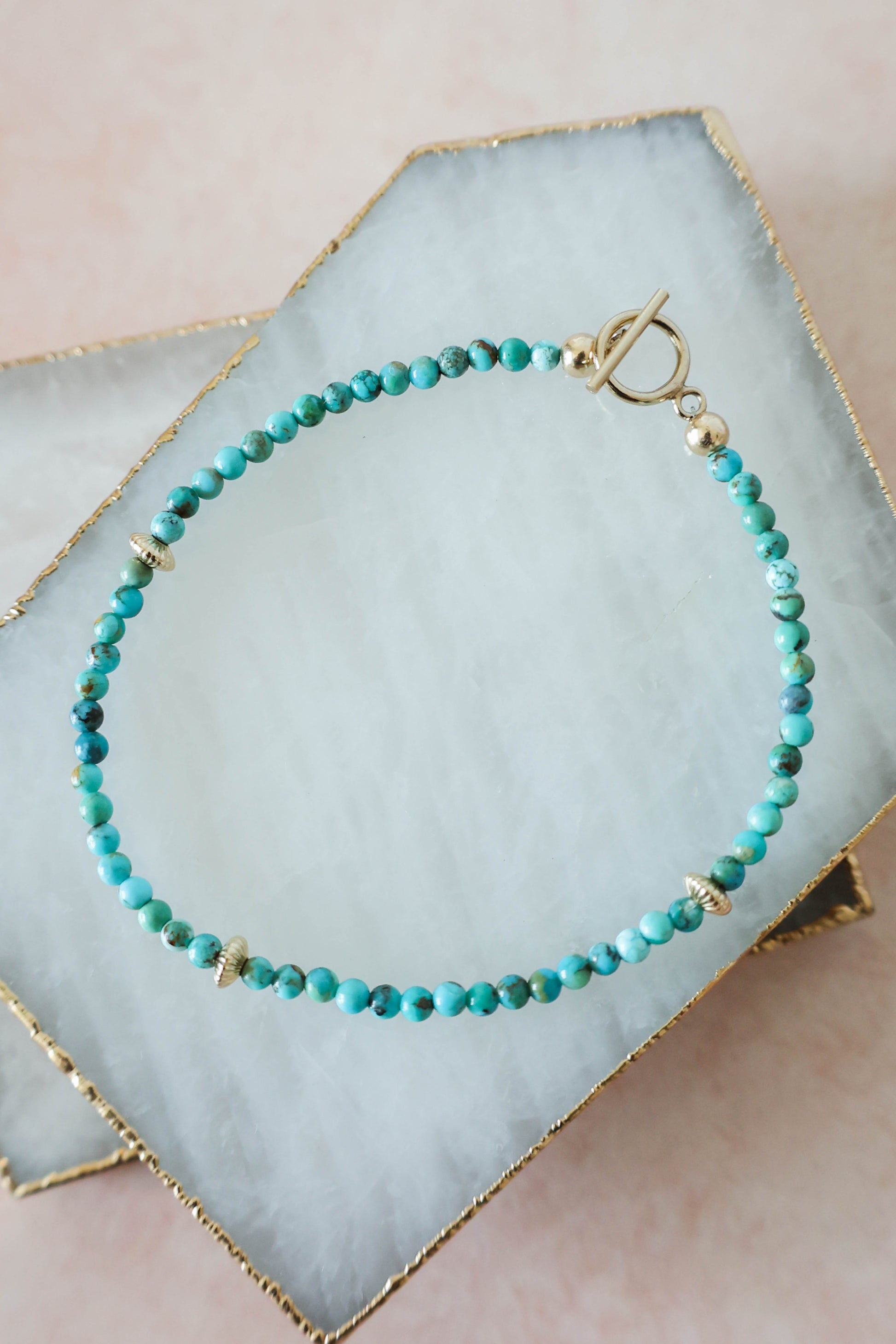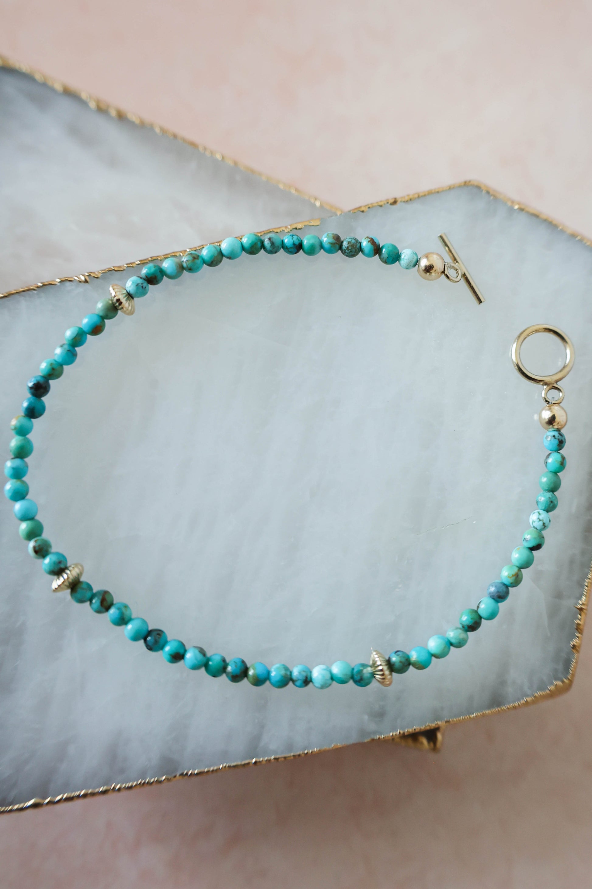 Light and bright beaded bracelet handcrafted with natural turquoise beads, corrugated saucer beads and a toggle clasp. The perfect pop of color to add to your wrist stack!