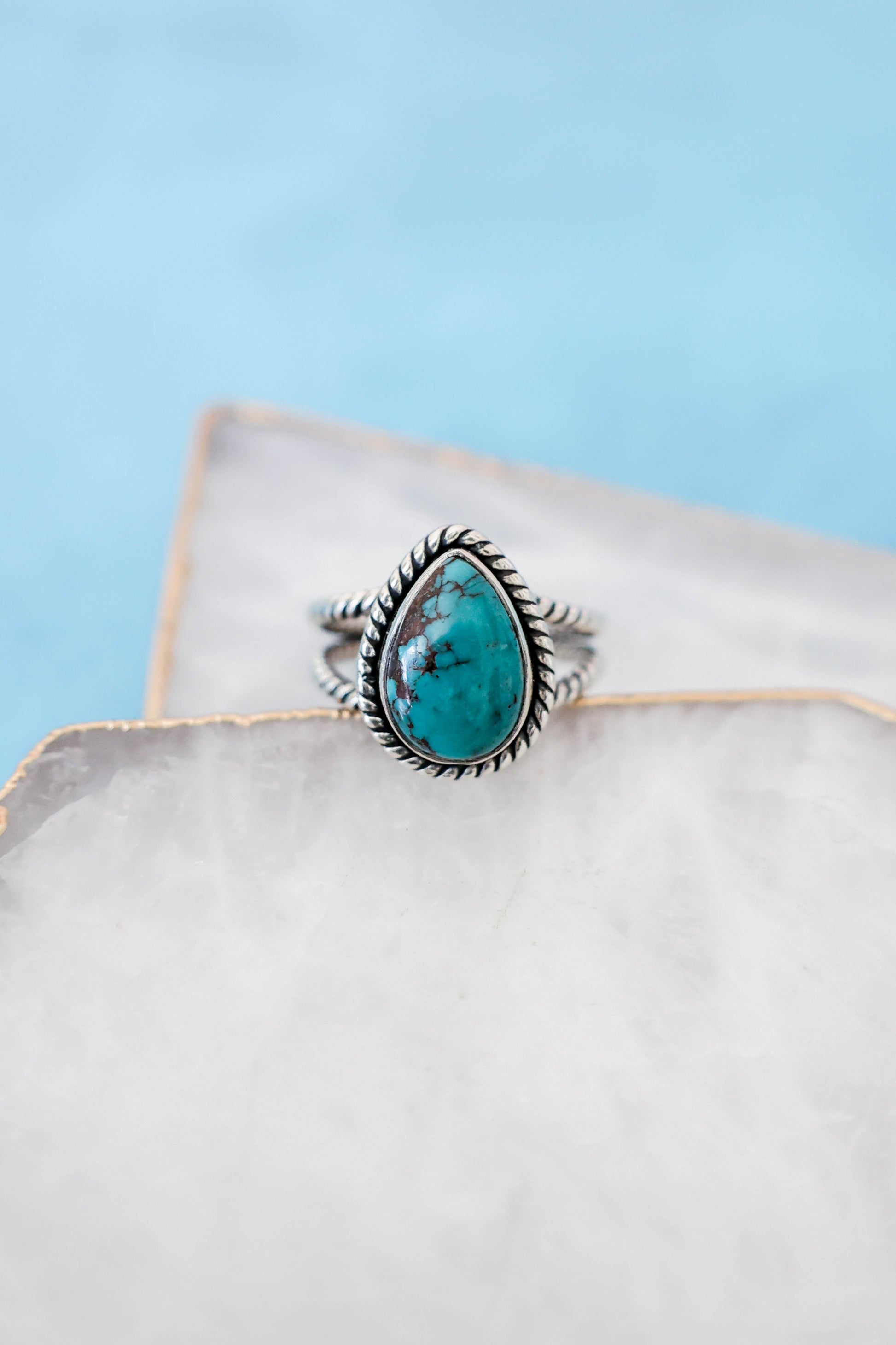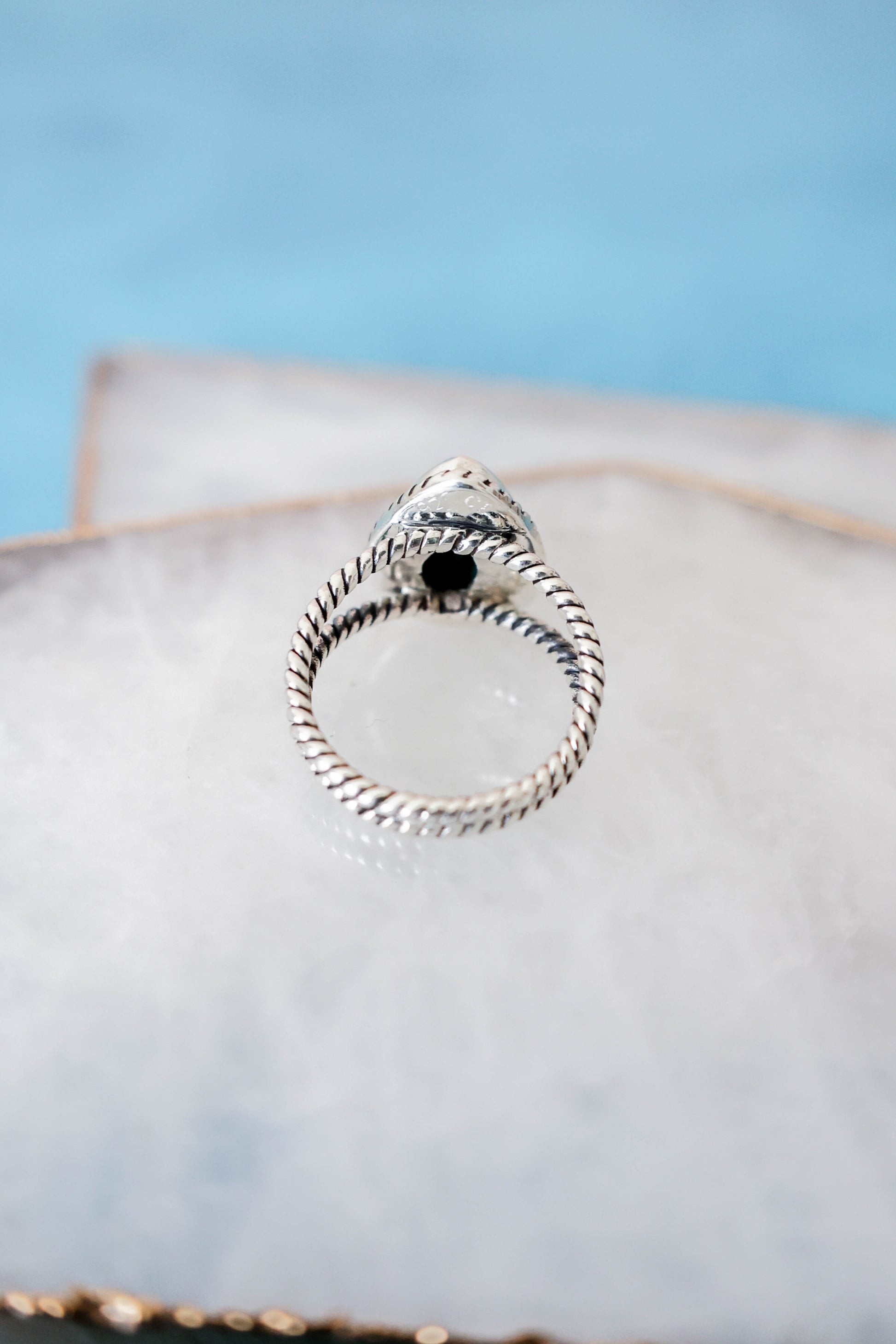 Genuine Turquoise statement ring featuring rope detailing surrounding the stone and a double roped band made of 925 sterling silver. Mid sized, comfortable and a go to piece for turquoise lovers!