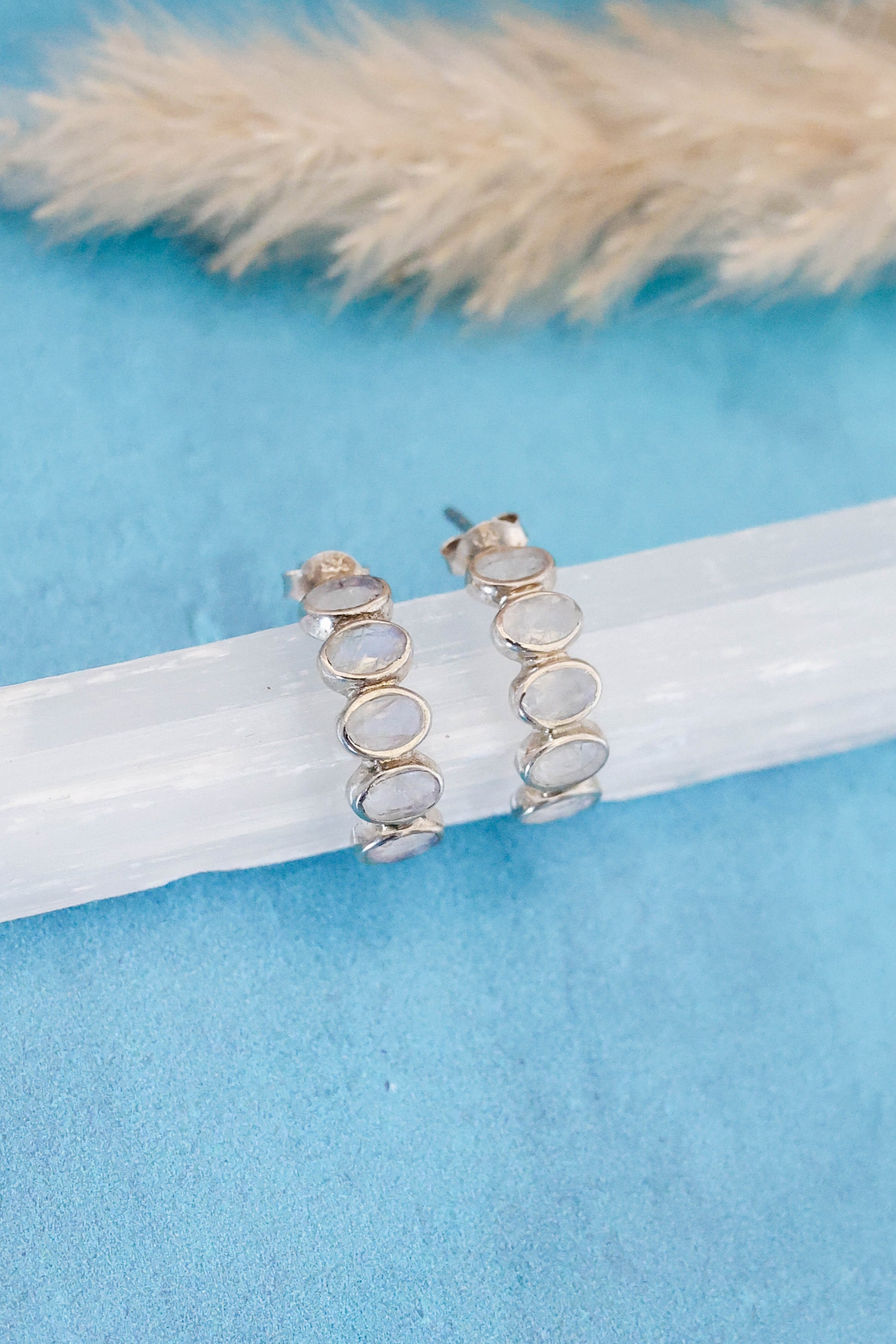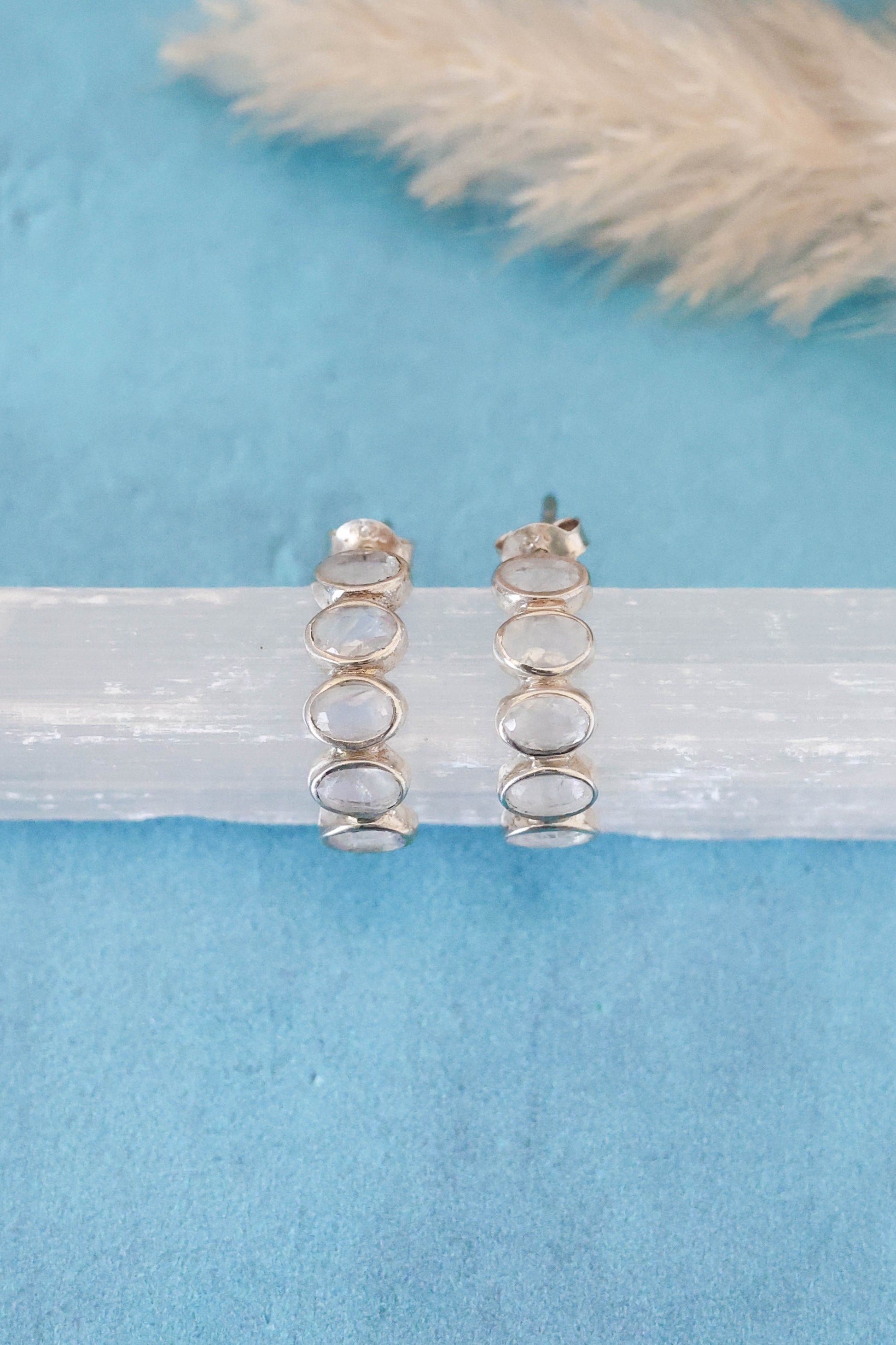 The must have half hoops! These multi-stone rainbow moonstone earrings are set in 925 sterling silver and we must say, you're going to love these. She's comfortable, cute, and will fit right into your ear stack. Make these a matching set with the 'Nova Ring' to complete your look!