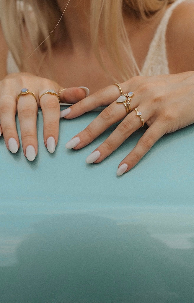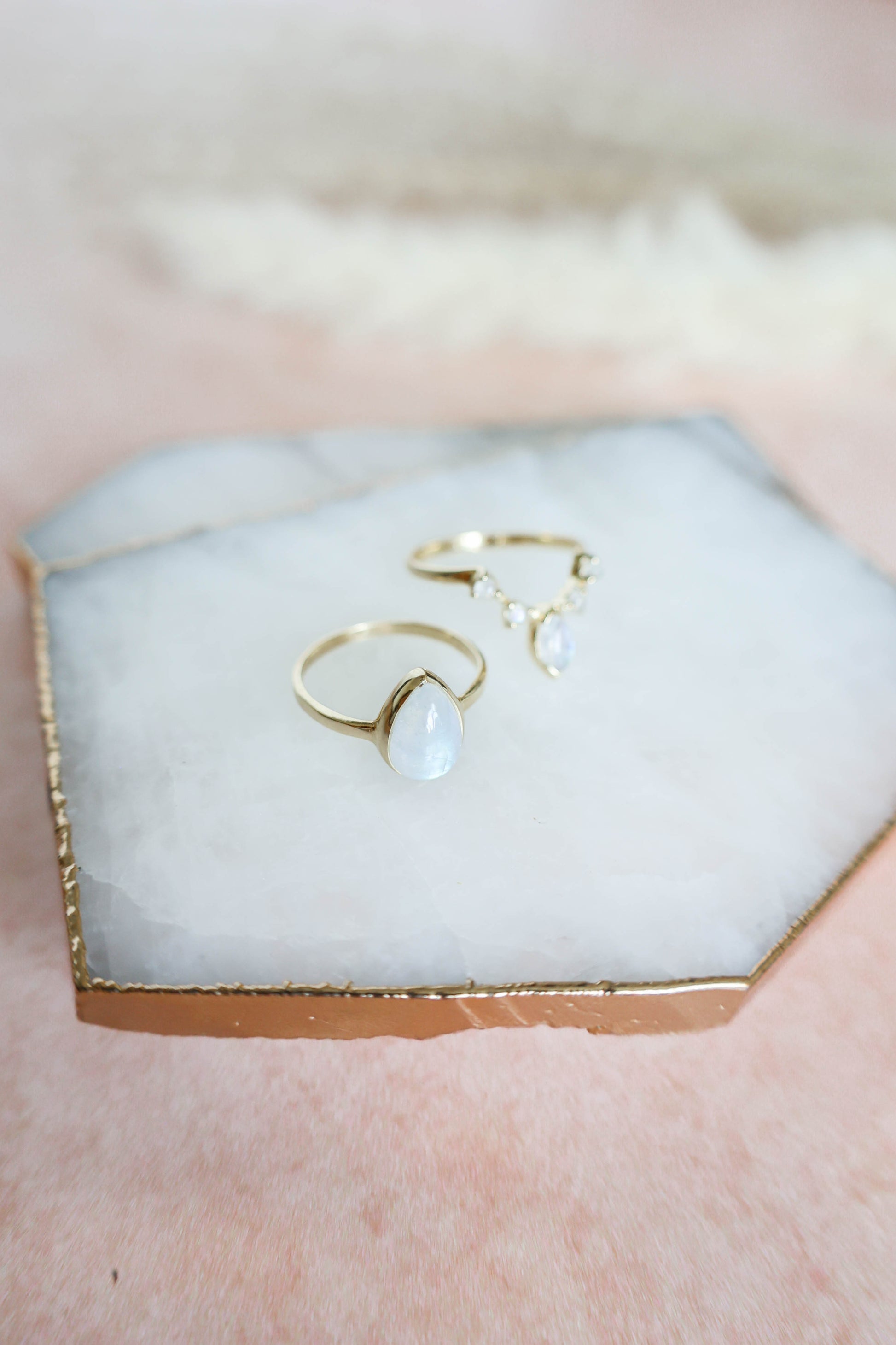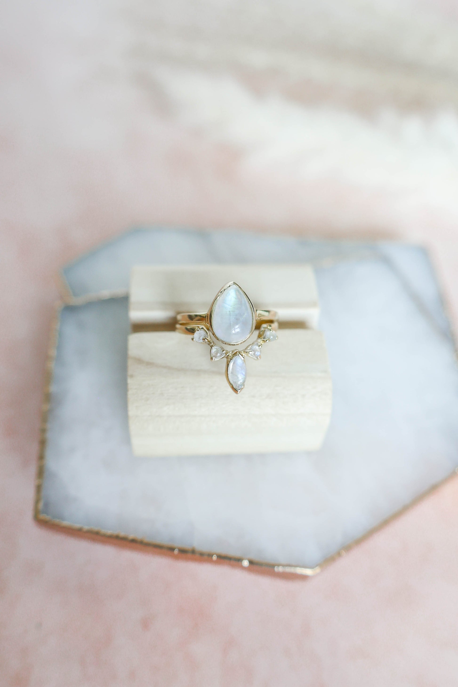 Love a stacked look but not sure where to start? This one is for you! An elegant and stunning statement piece, stacked and ready to go! This set features a pear shaped rainbow moonstone ring paired with a curved stacker featuring 4 round stones and a marquise stone in the center, set in 14k gold vermeil.