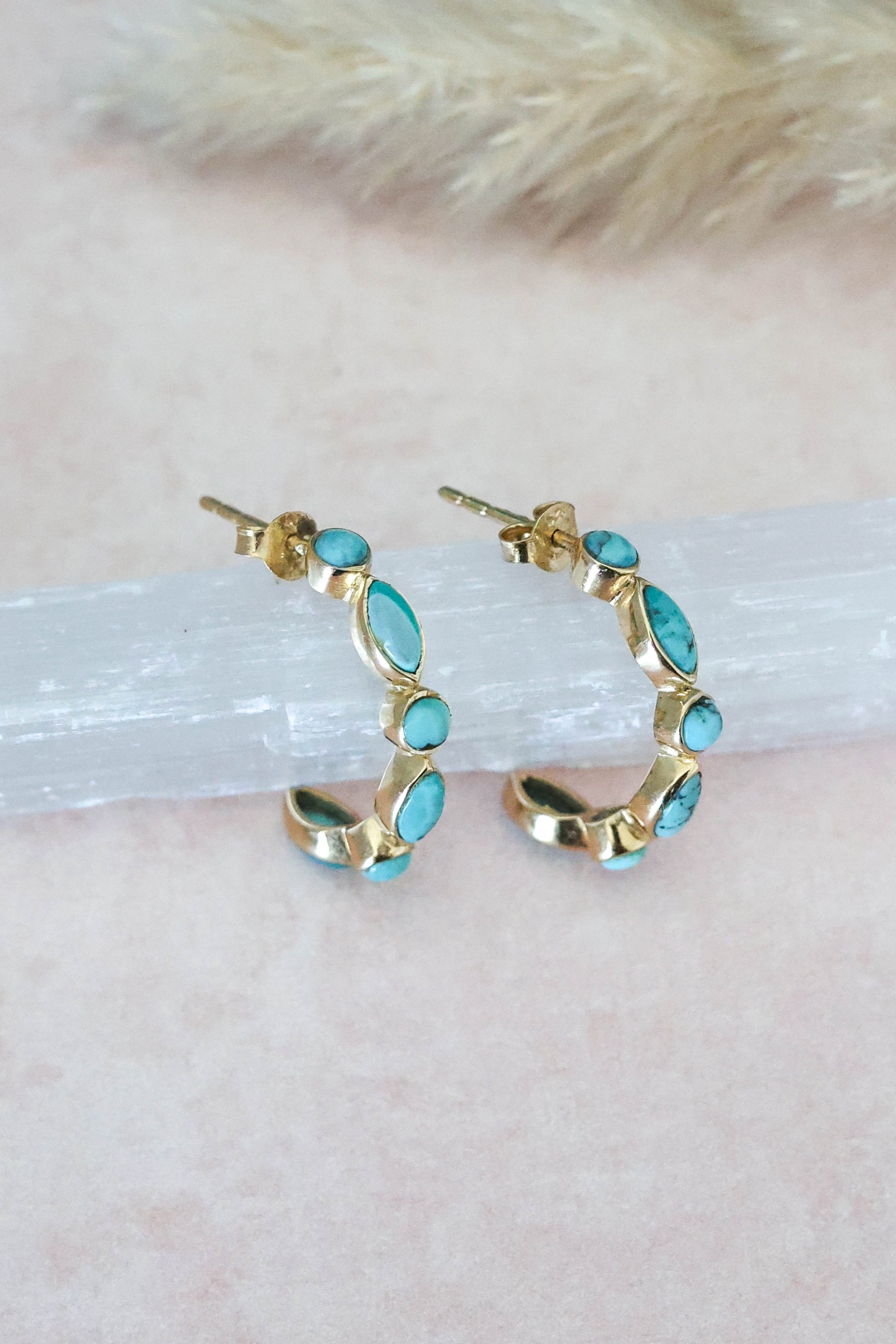 It's all in the details and these earrings have it all figured out. These dainty turquoise half hoops set in 14k gold vermeil are ready to fit right into your ear stack. Their marquise stones between two dainty round stones give them dimension and a unique look, while still staying minimal and simple. Make these a matching set with the 'Olivia Ring' to complete your look!