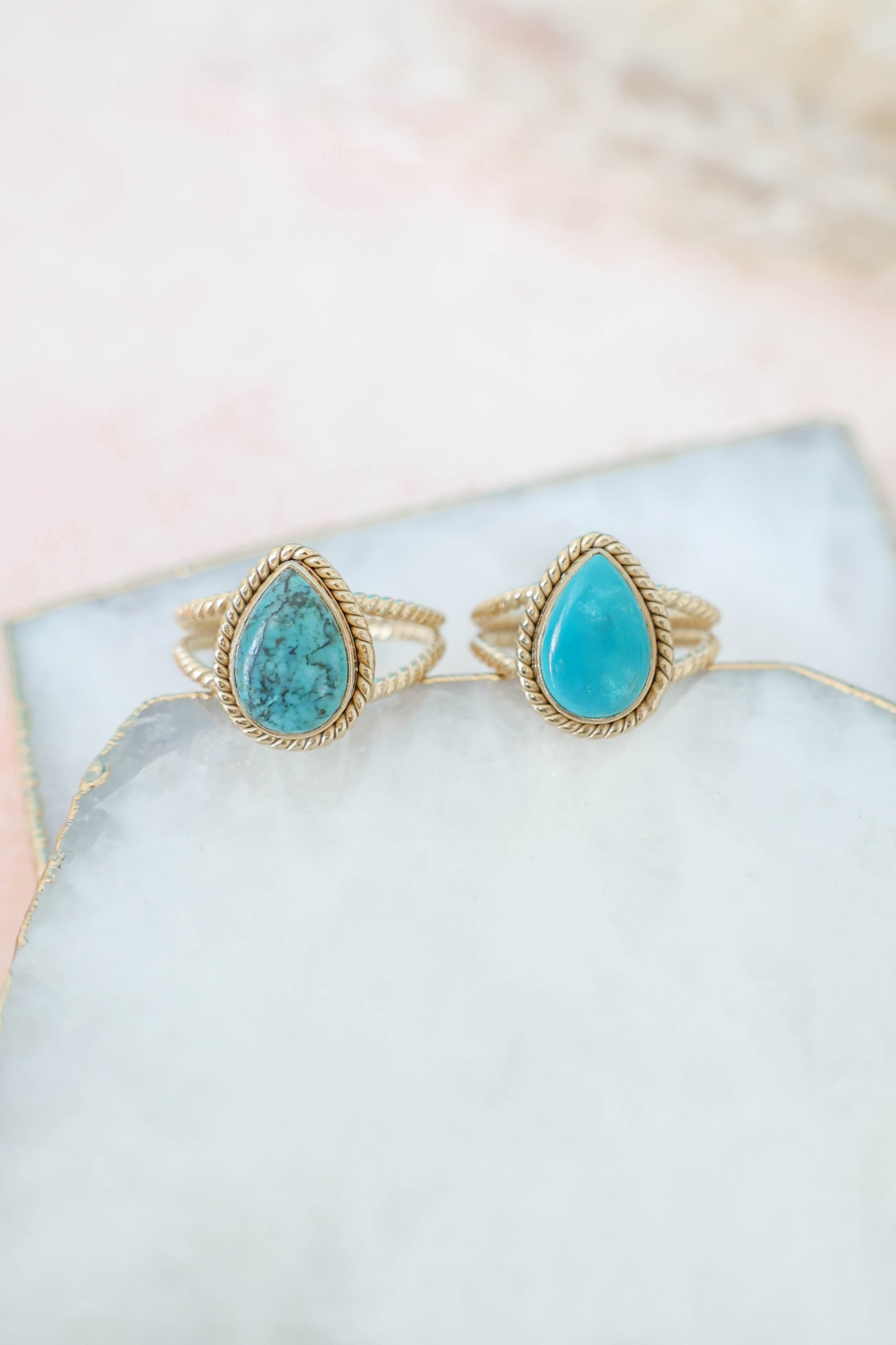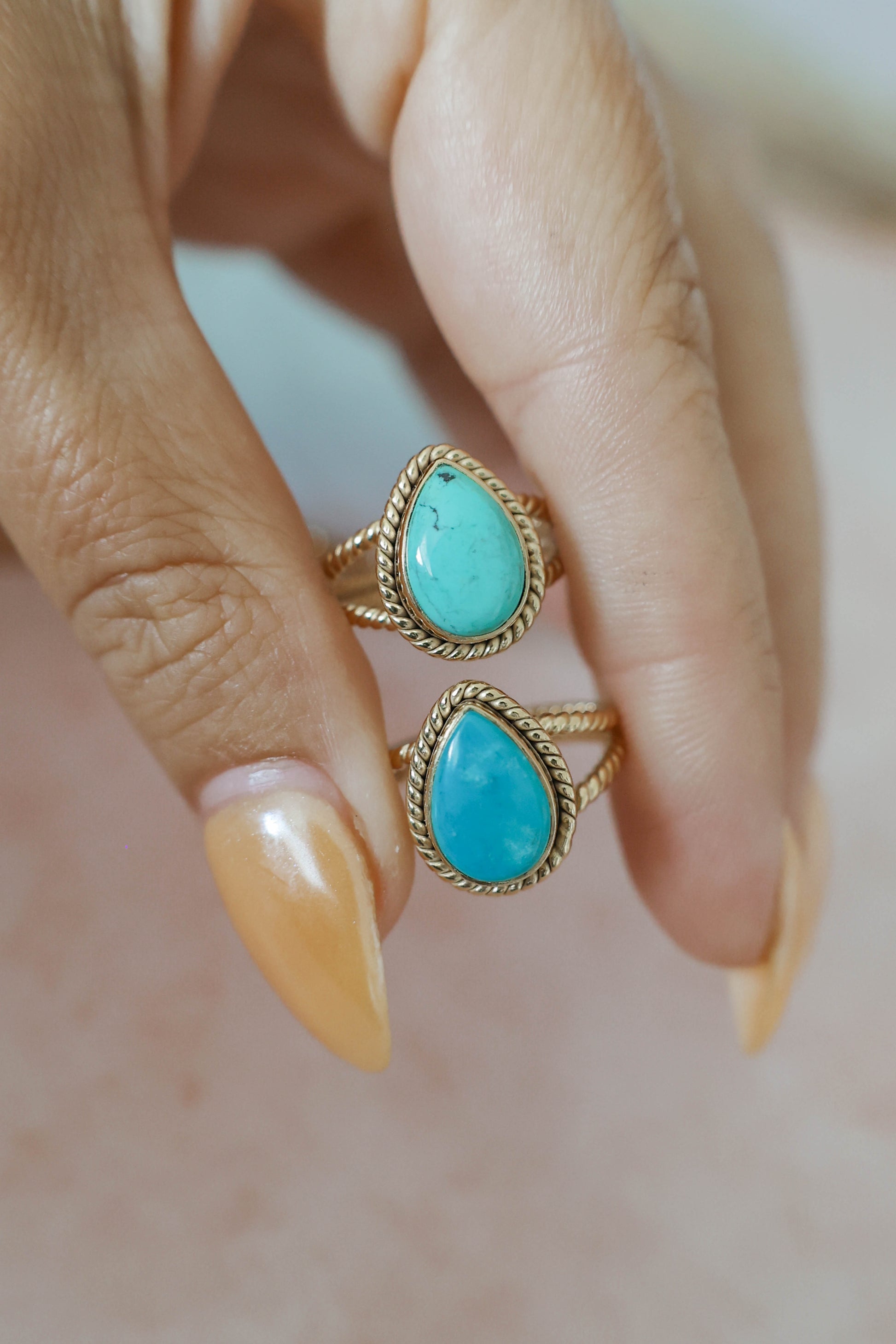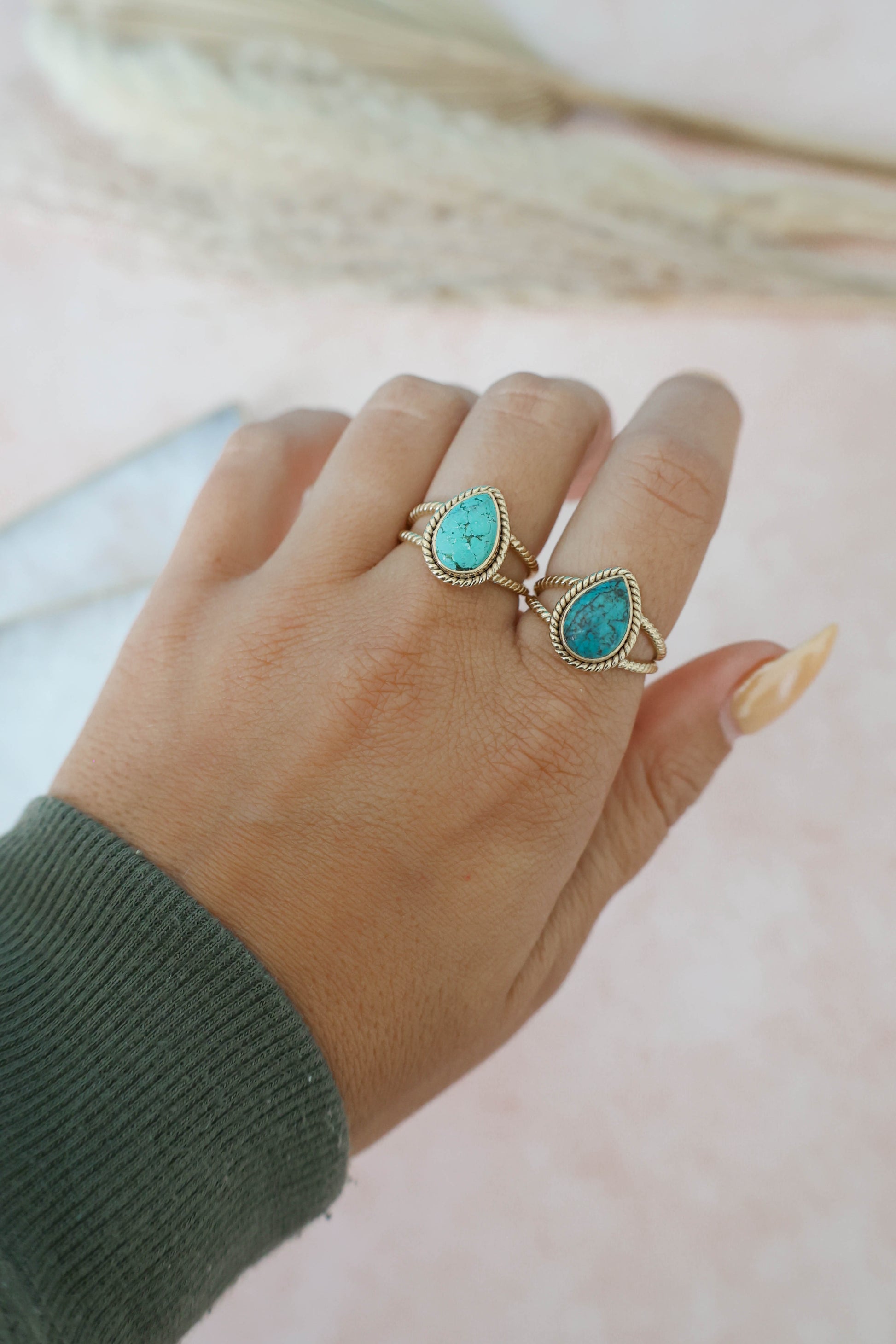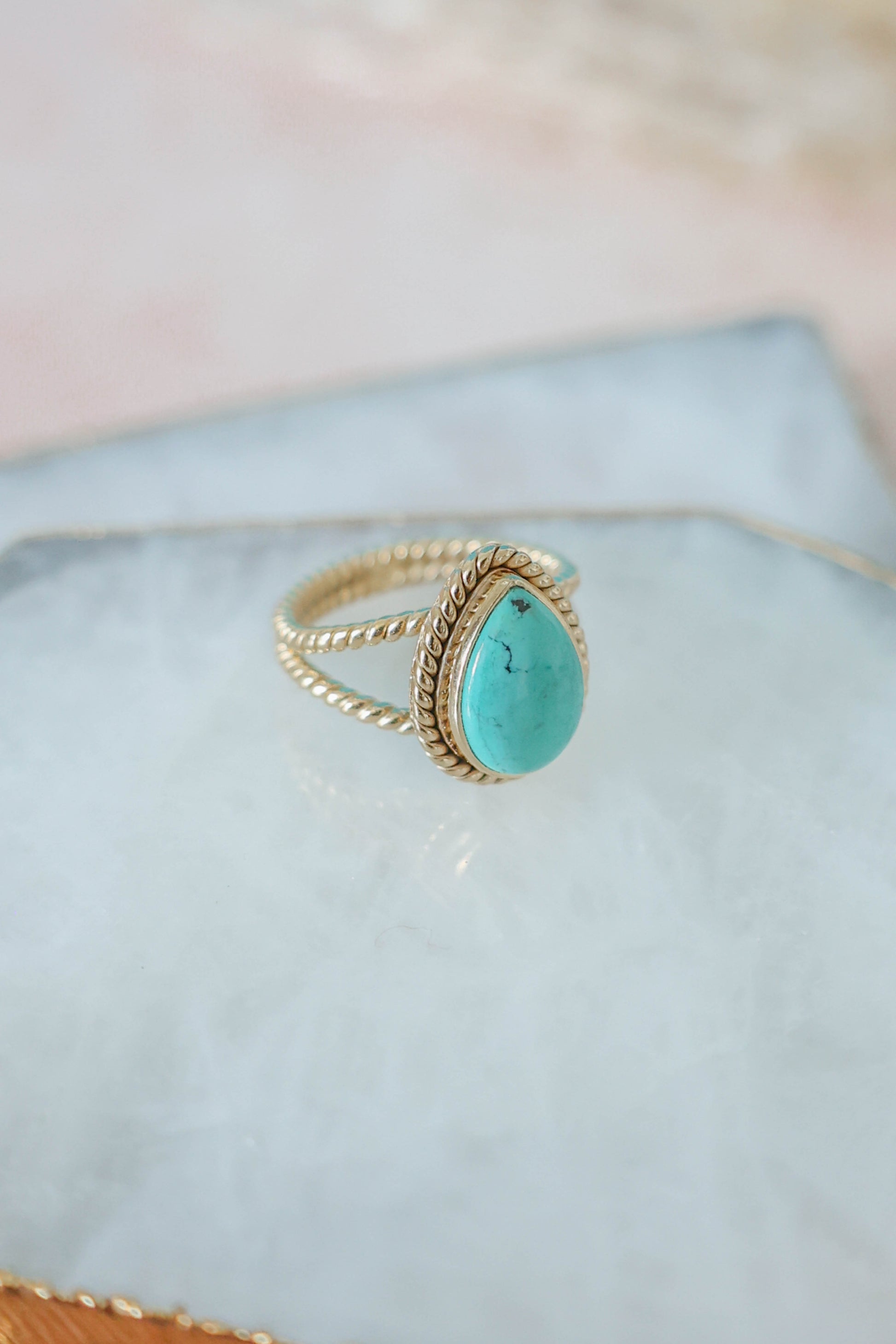 Turquoise pear shaped ring featuring rope detailing surrounding the stone and a double roped band. Mid sized, comfortable and a go to piece to make a statement!