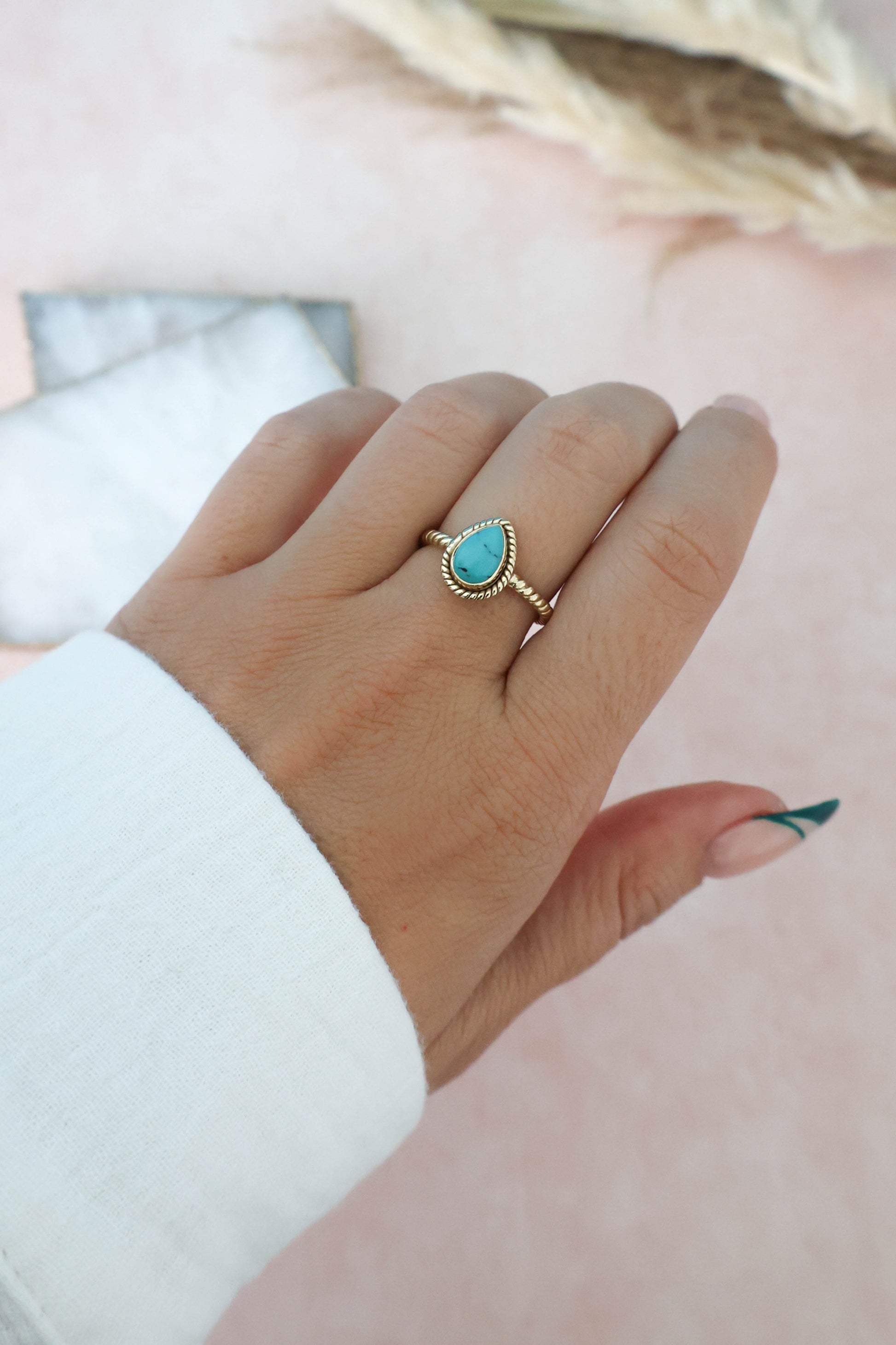 Dainty pear shaped turquoise with rope detailing surrounding the stone and a roped band made of 14k gold vermeil. A classic, simple, everyday staple with a pop of color!